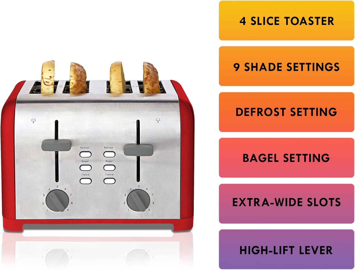 - VERSATILE TOASTING OPTIONS: Elevate your breakfast game with the 4-slice toaster! Its 1400W power, extra-wide slots, and self-adjusting bread guides handle everything from English muffins to Texas toast. With 9 customizable shade settings, you can achieve the perfect toast for every family member, ensuring a delicious and personalized start to your day.