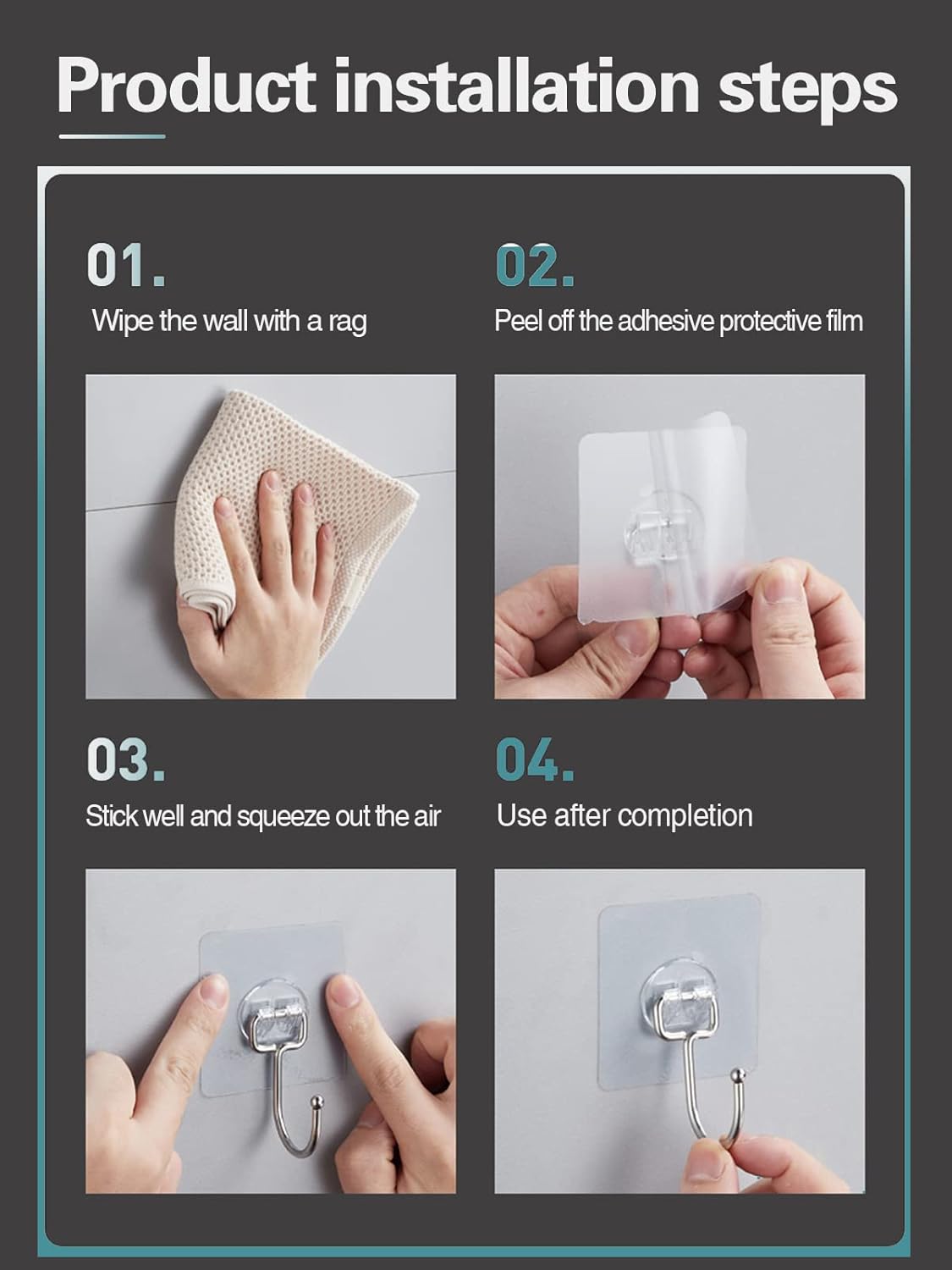 - 🏡【Easy to use】 - No tools are needed for installation. Just peel off the film on the back and stick it on to squeeze out the air. Easy to use, no need for nails, screws, or drilling damage. For large items, multiple adhesive hooks can help to disperse the weight of the object.