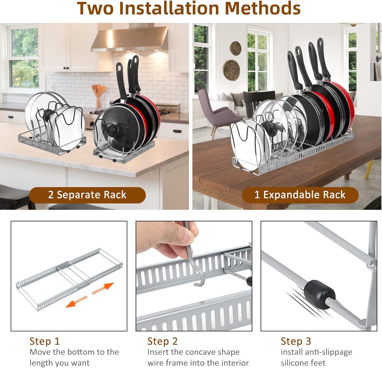 - Easy to install - You only need to pull out the base, and then insert the partition into the slot. No tools required to install. Even a little kid can install the pot lid holder in a couple minutes. All essential parts of the pot lid organizers inside cabinet is in the box,we also give 8 pieces of silicone pad ,which can be installed at the bottom to protect our cabinet countertops from scratches.This is the best kitchen cabinet organizers and storage gift for your lover, family and friends.