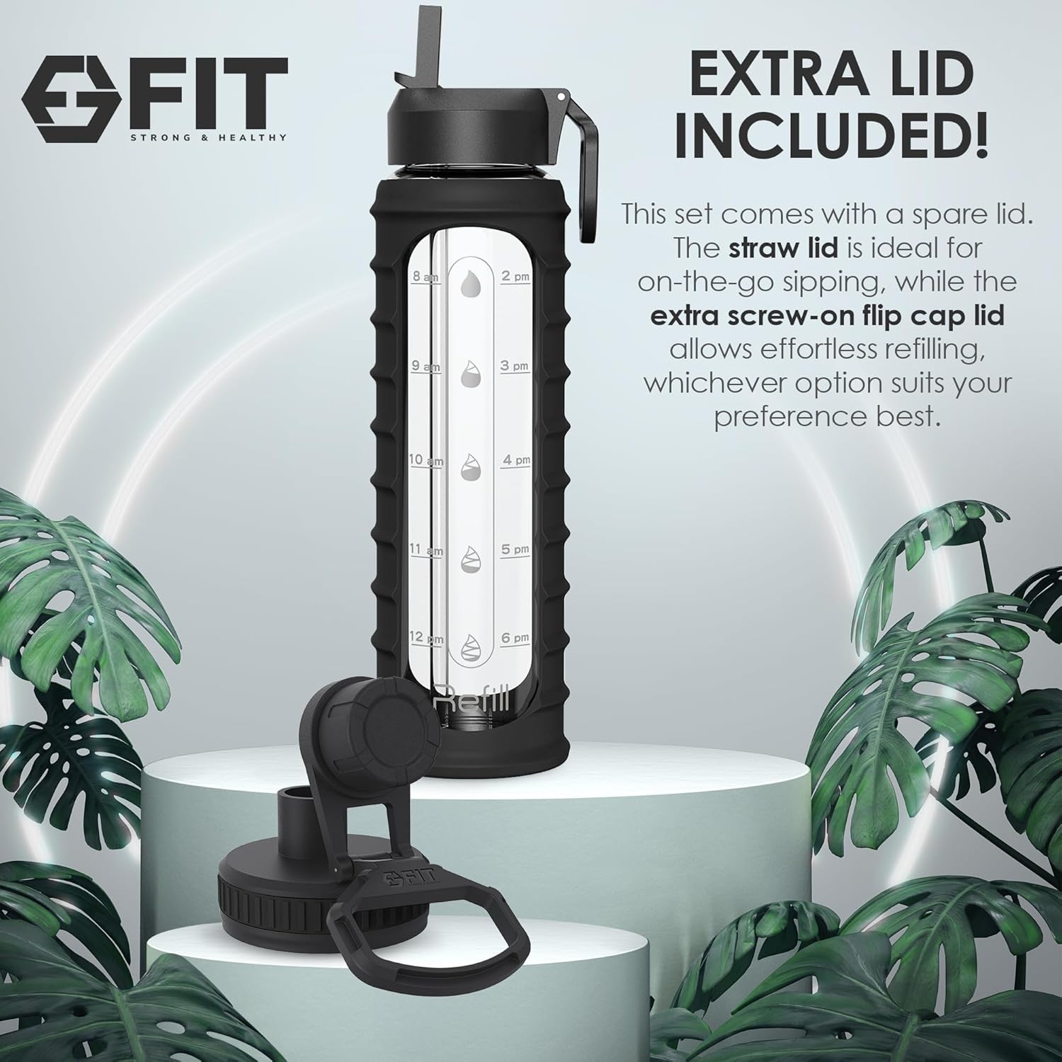 FIT Strong & Healthy 32 oz Glass Water Bottle with Straw Lid, Time Marker, Sleeve & Extra Lid - Motivational, Wide Mouth 1 Liter Glass Drinking Bottle