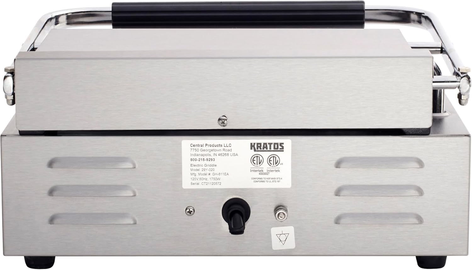 - {COMMERCIAL GRADE} This panini grill features heavy duty stainless steel construction and durable cast iron plates. It is ETL and ETL Sanitation certified for commercial use. Warranty void if used in residential settings