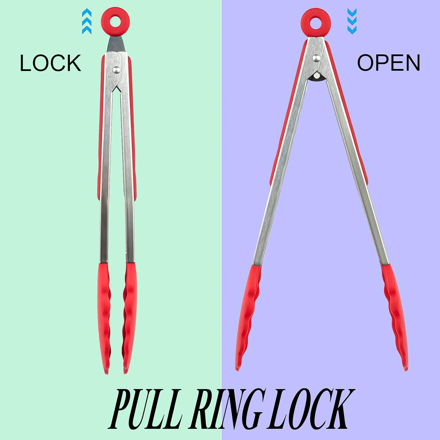 - EQUIPPED WITH A PULL-RING TECHNOLOGY: Our kitchen tongs are designed with a locking mechanism. The pull ring technology will keep your tongs from opening and closing. Simply pull the ring to lock and push to unlock.