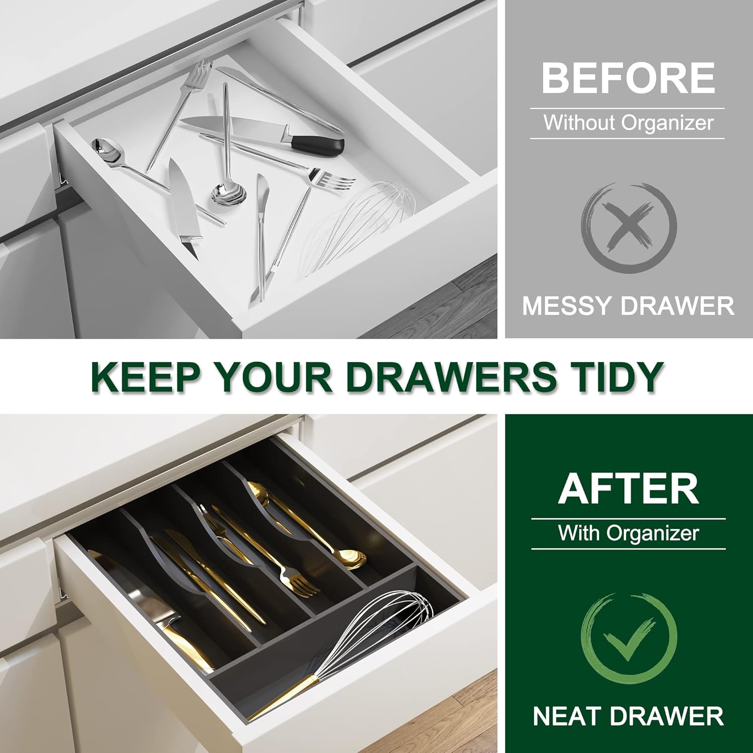 - 【Made of natural bamboo】Our flatware organizer is made of natural bamboo. The material is taken from bamboo that have grown for more than 4 years which make our silverware holder for drawer use a durable kitchen piece that ll last you for years. The Environmentally material keep our flatware & utensil water and odor resistant. Even the knife won't leave scratch on it.