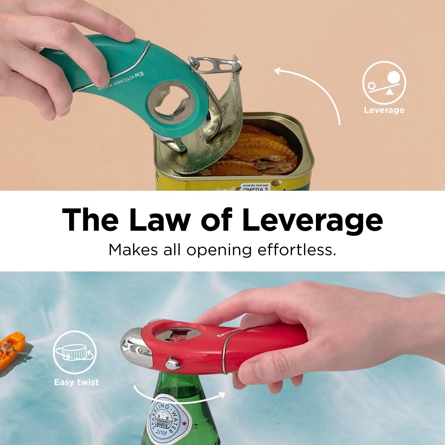 - One Pick x Wide Application: All-in-one multi bottle opener; perfect for beer bottle tops and water bottle caps; can also be used as a jar and can opener; works for pull-tab cans, soda cans, and different jar lid sizes; enjoy camping or BBQing with Kitchen Mama