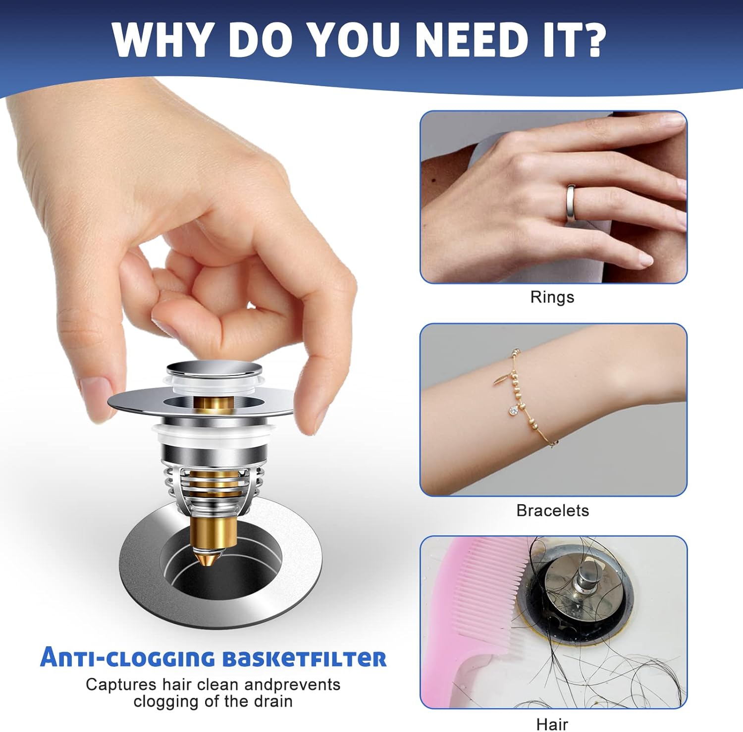 - 【Anti-Drain Clogging Design】The bathroom sink strainer has an anti-clogging basket filter inside, which effectively prevents drain clogs such as hair, bracelets, tea leaves or rings. Just gently rotate the elastic cap and remove the elastic core to easily clean hair.