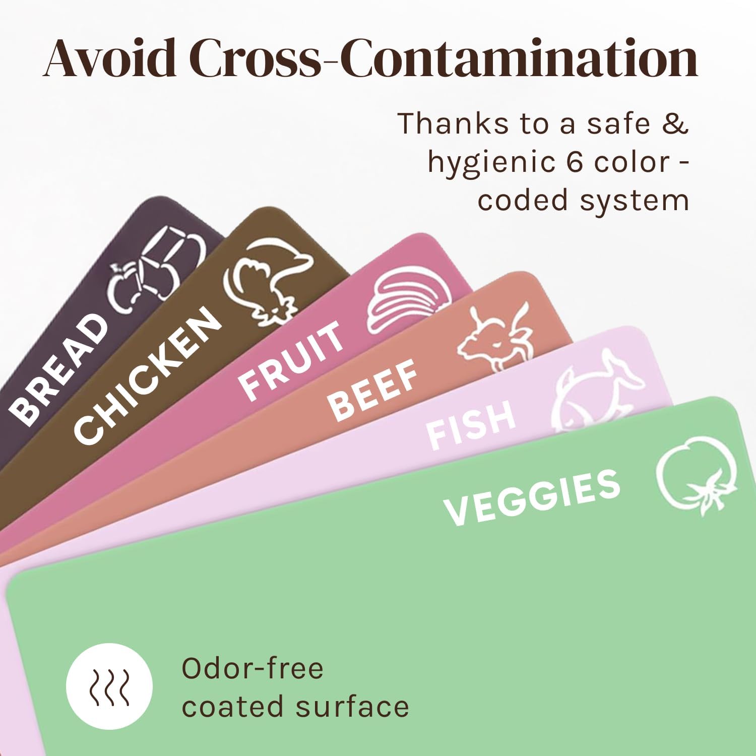 - NON-POROUS ODOR RESISTANT COATING - Naturally nonstick - The color-coded plastic cutting boards prevent unwanted transfer of organisms from one substance to another for you & your family's safety.