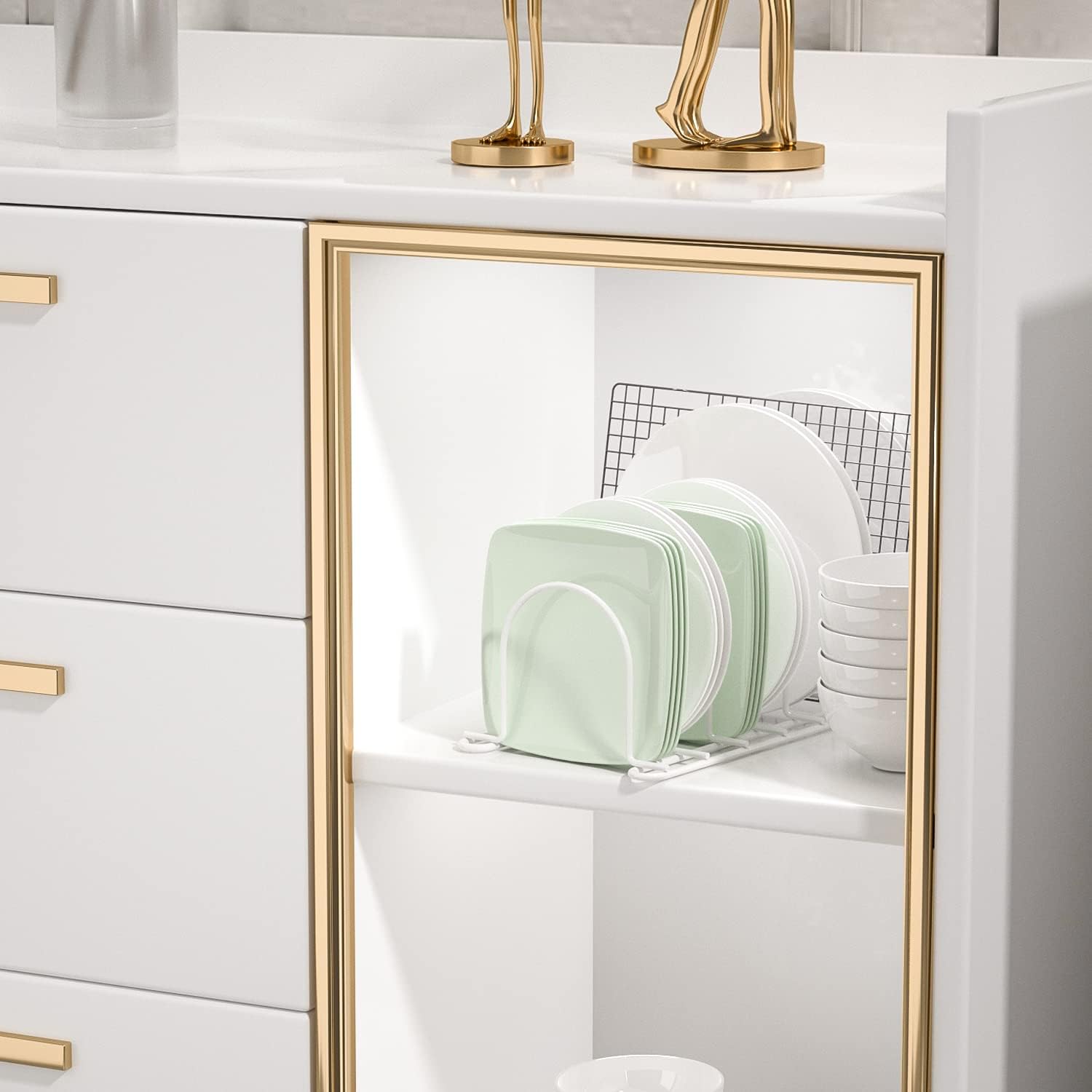 - √ 【Keep your cabinets well-organized 】The plate rack can store your pots lid,cutting board, cookie sheets , pans , bakeware , file folders,reusable bags and bee wraps orderly