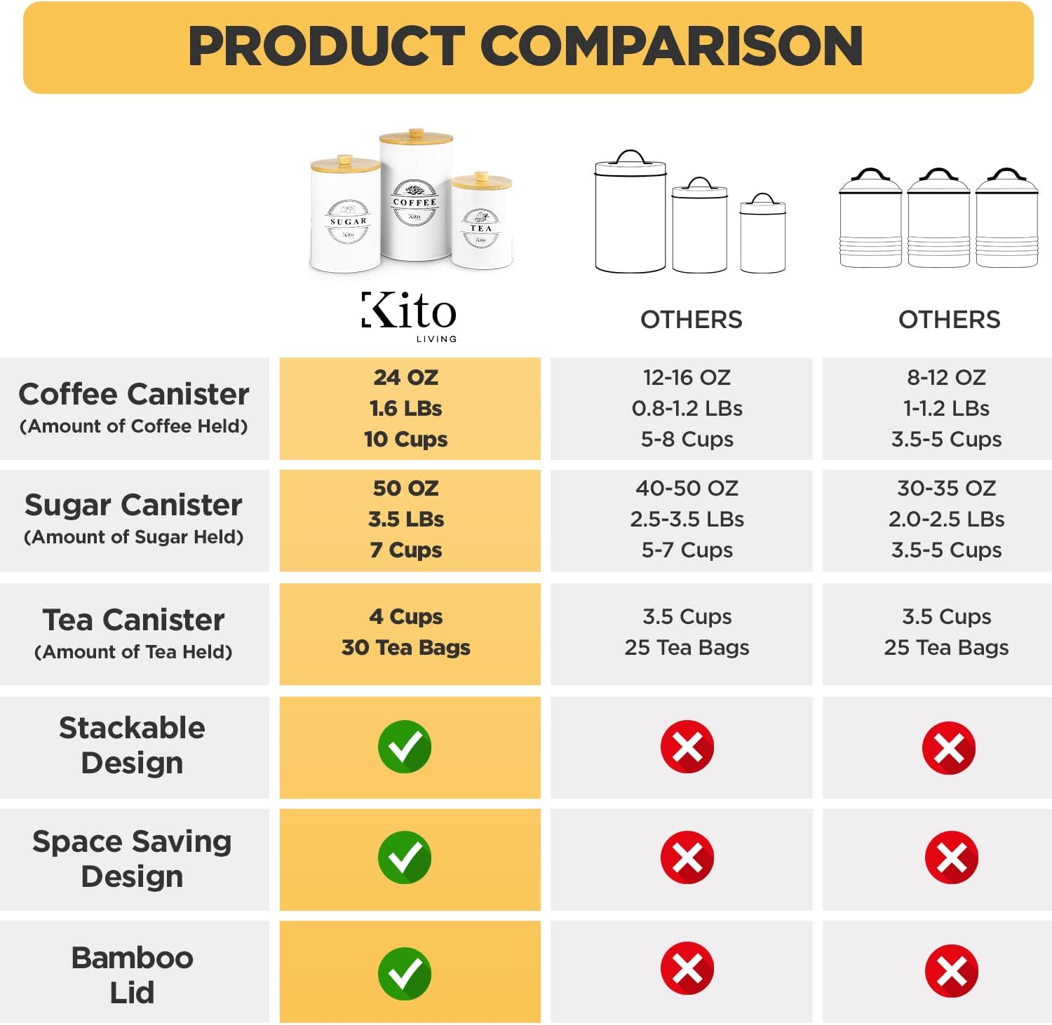 - SPACE SAVING AND STACKABLE: These airtight container canisters feature a stackable design so you can place them on your kitchen counters while saving space and keeping them organized. Each pack comes with a Sugar Canister, Tea Canister, and Coffee Canister