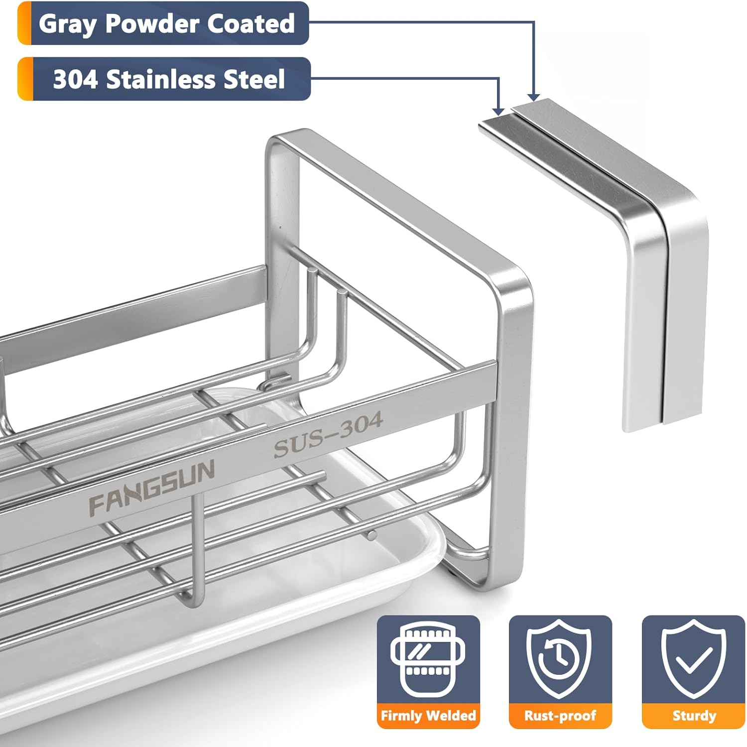FANGSUN Large Sponge Holder for Kitchen Sink, 304 Stainless Steel Sink Caddy Organizer with Removable Drip Tray, Kitchen Countertop Dish Soap Holder, Not Include Soap Dispenser, Grey