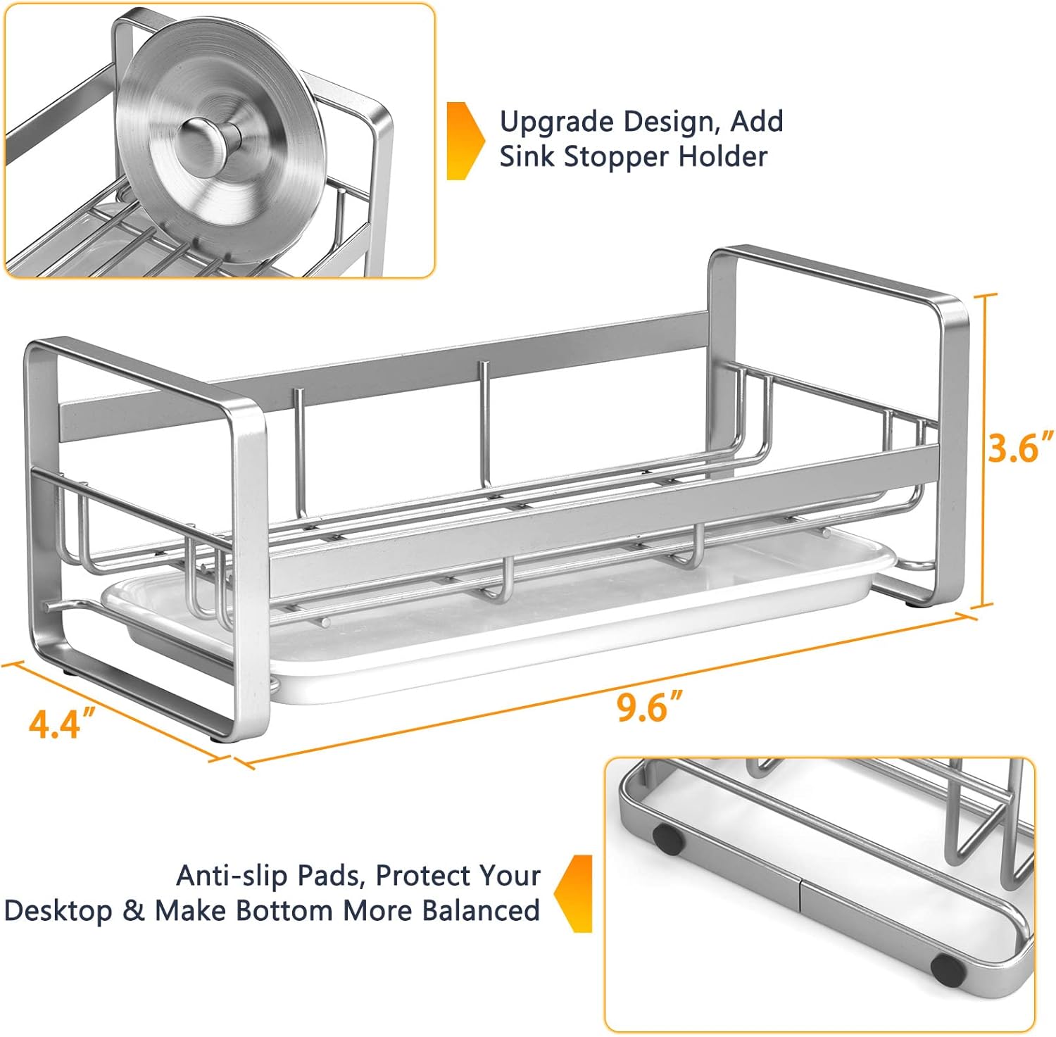- Larger Size & Innovative Design: Our sponge holder provides more storage space for your kitchen accessories, measuring 9.6"L x 4.4"W x 3.6"H, it fits perfectly next to the sink, add sink stopper holder design, can easily hold a dish soap dispenser, a hand soap dispenser and up to 2 sponges and 2 sink stoppers, keep all cleaning items go in one compact place ( Note: No dispensers or sponges come with it. )