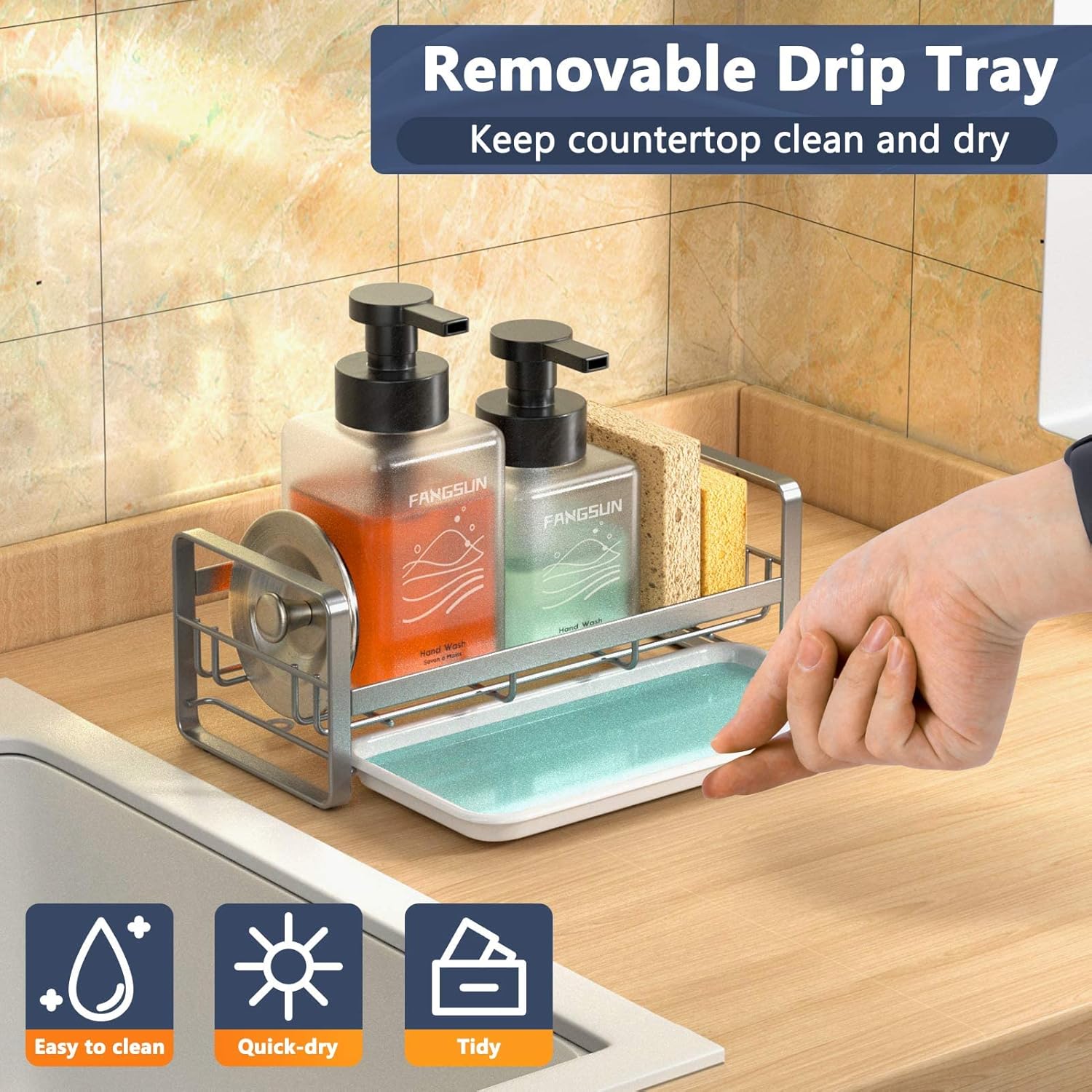 - Drip Tray for Keep Countertop Dry: The sponge holder comes with an easily removable drip tray to prevent the dripping water from wetting the countertop, easy to clean and dishwasher safe