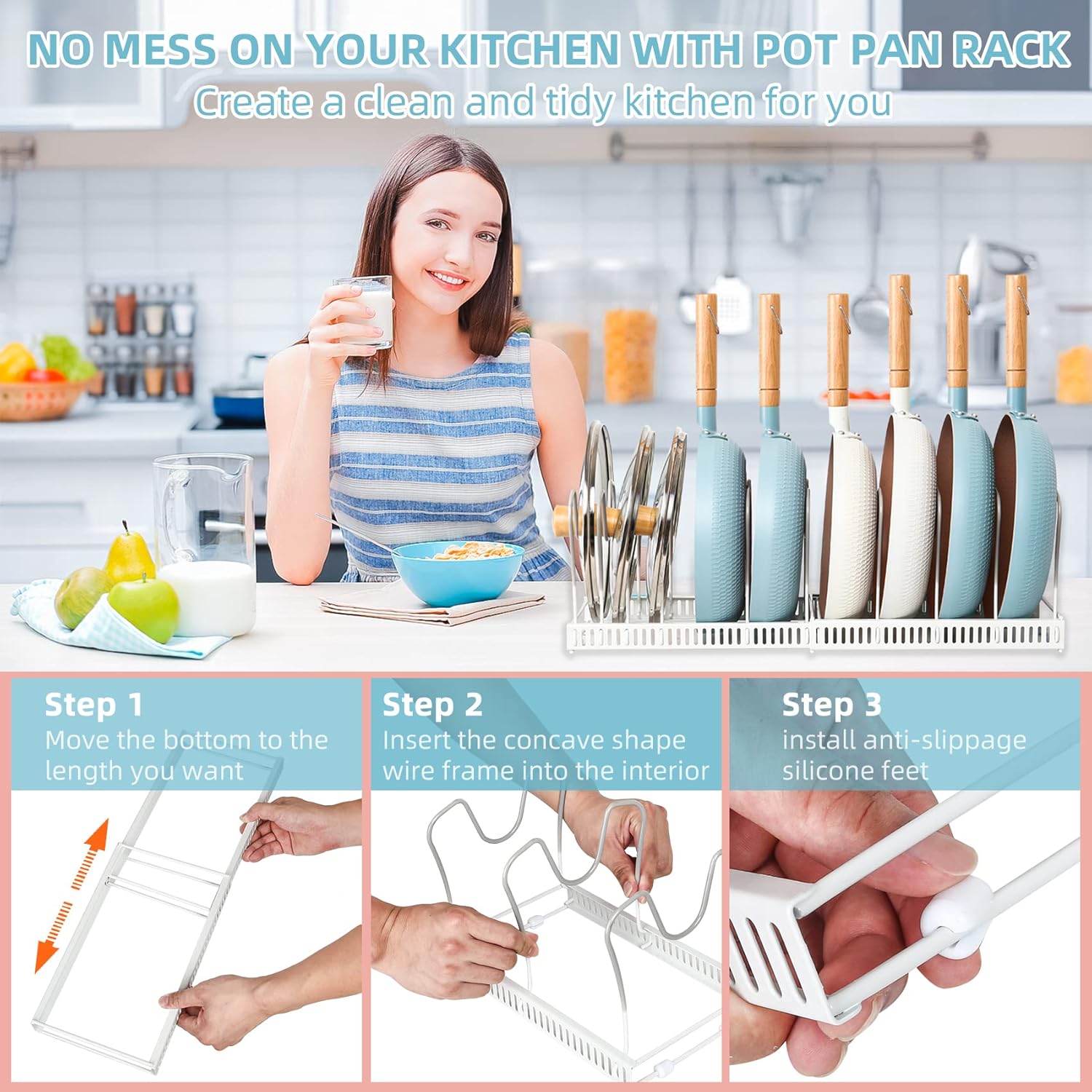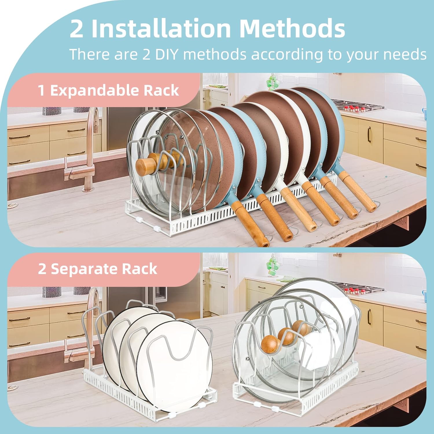 Expandable Pot & Pan Organizer - Cabinet Cookware Rack with 10 Adjustable Compartments & Pot Lid Holder