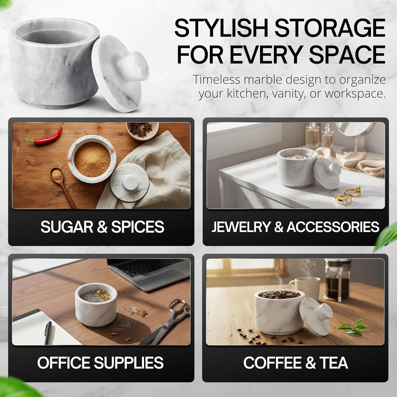 Flexzion Multi-Purpose Marble Container with Lid - Salt, Pepper, Paprika and Powdered Herbs, Marble Box for Jewelry, Watches and Accessories (White)