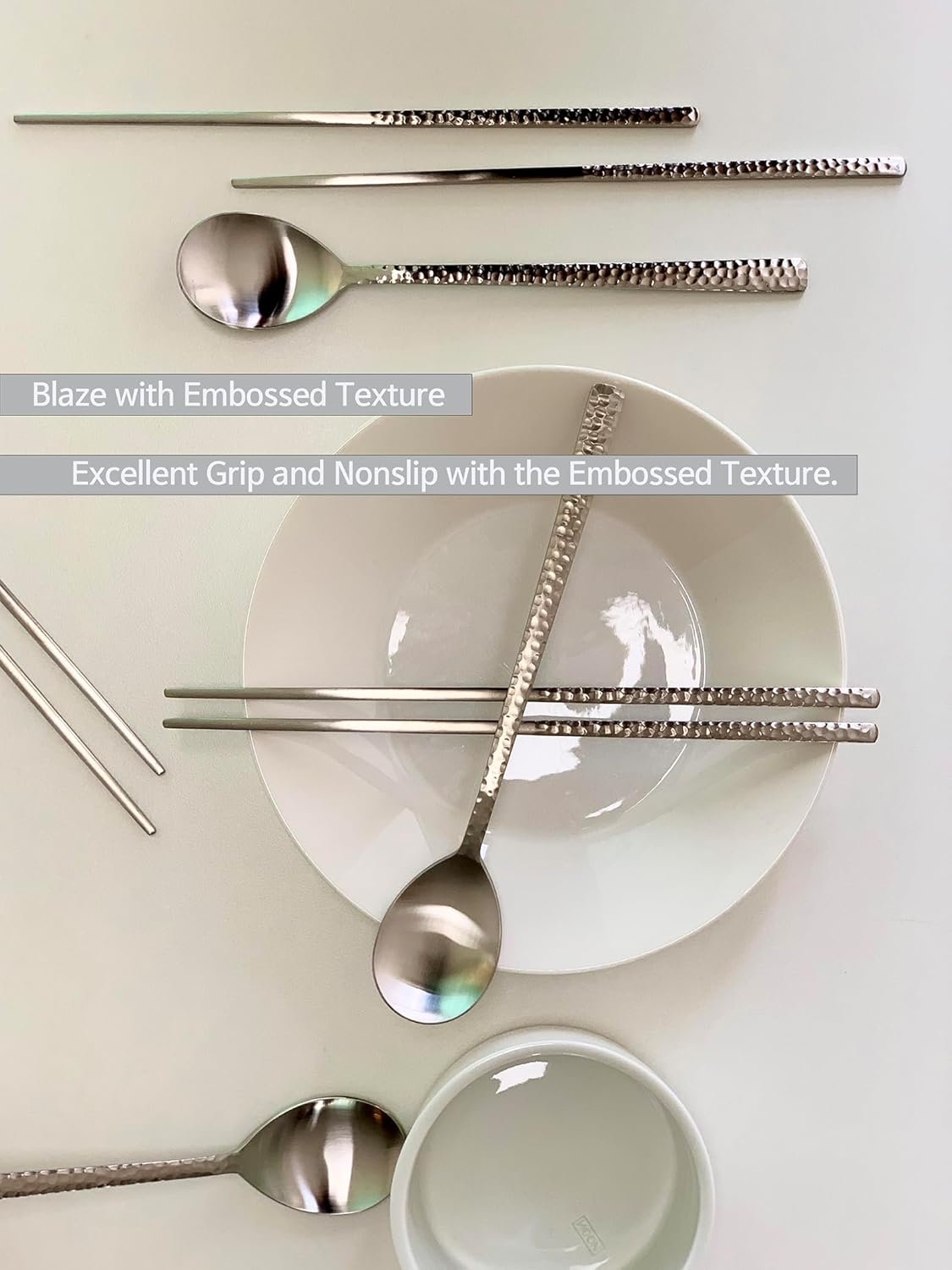 - 【LUMINOUS SILVER WITH UNIQUE TEXTURE】Embossed texture on the handle side of the spoon and chopsticks shine everywhere you see. This is unique design feature and the value never fade off. The embossed texture also helps for the better grip and nonslip while you use it.