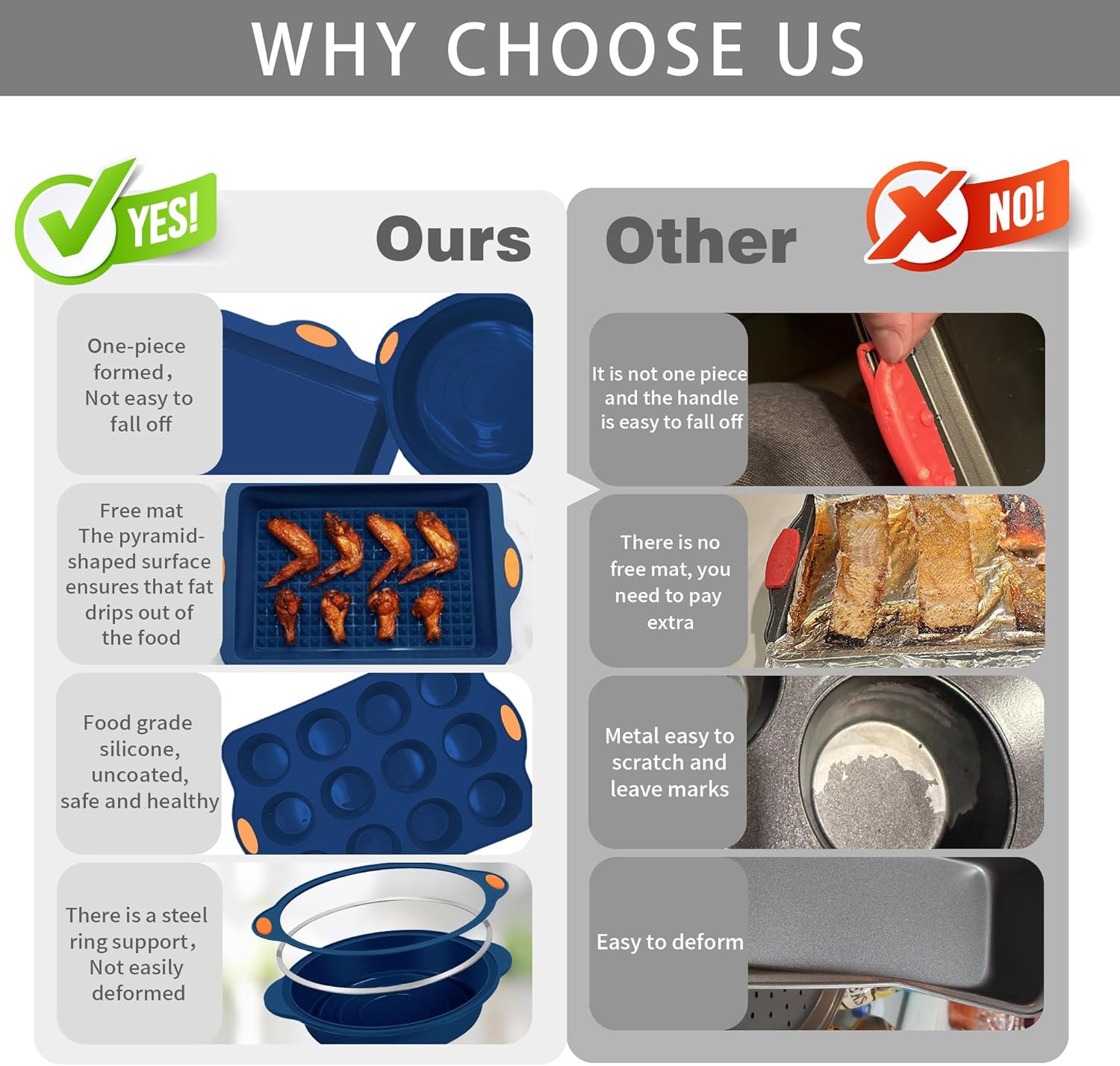 To encounter 31 Pieces Silicone Baking Pans Set, Nonstick Bakeware Sets, Non-Stick Silicone Molds, with Metal Reinforced Frame More Strength, Navy Blue