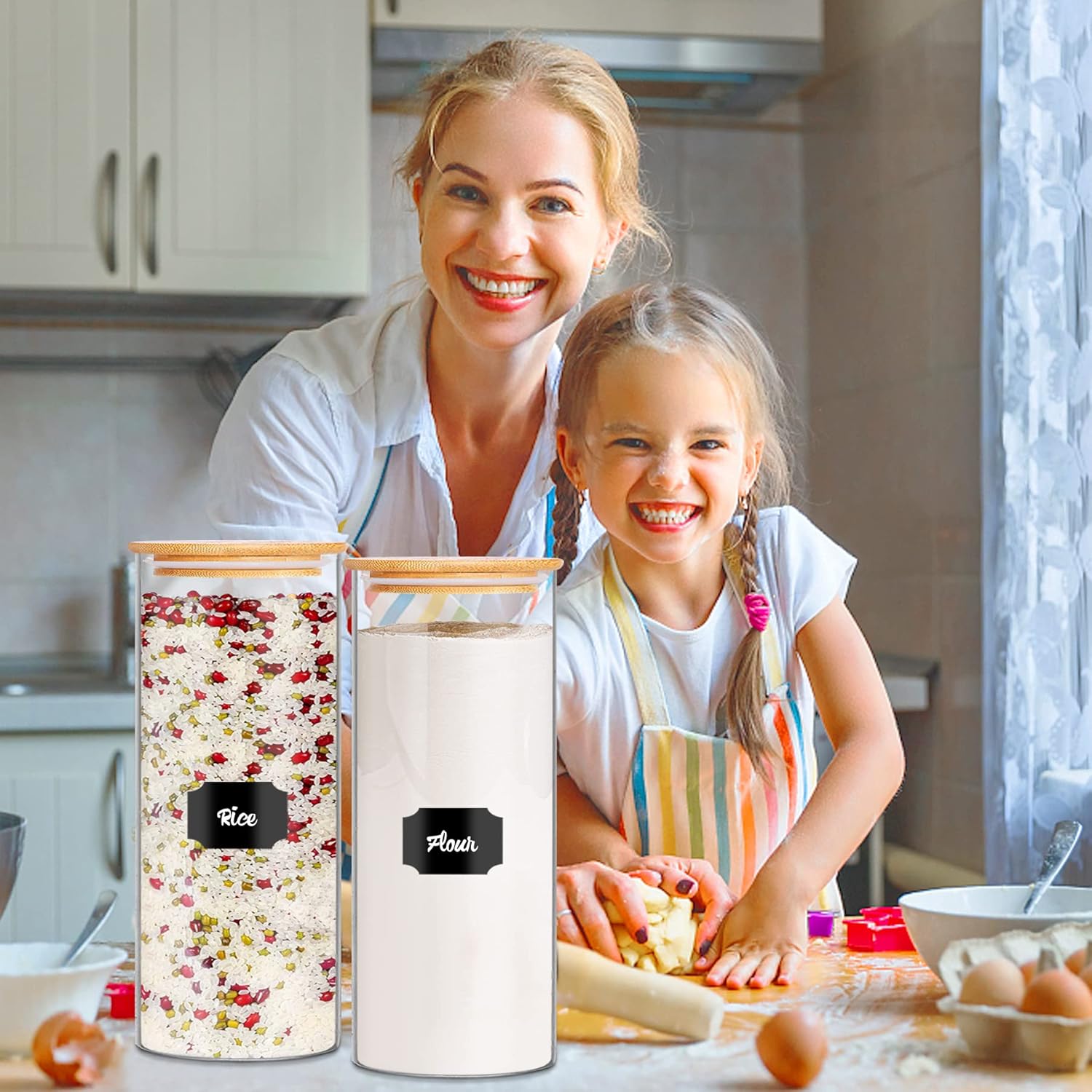 - 【Label & Stack System】Stay perfectly organized with 58 colorful labels included with these kitchen jars. The uniform glass pantry storage containers set with airtight bamboo lids stack neatly to maximize space - ideal for small kitchens storing flour, nuts or pet treats.