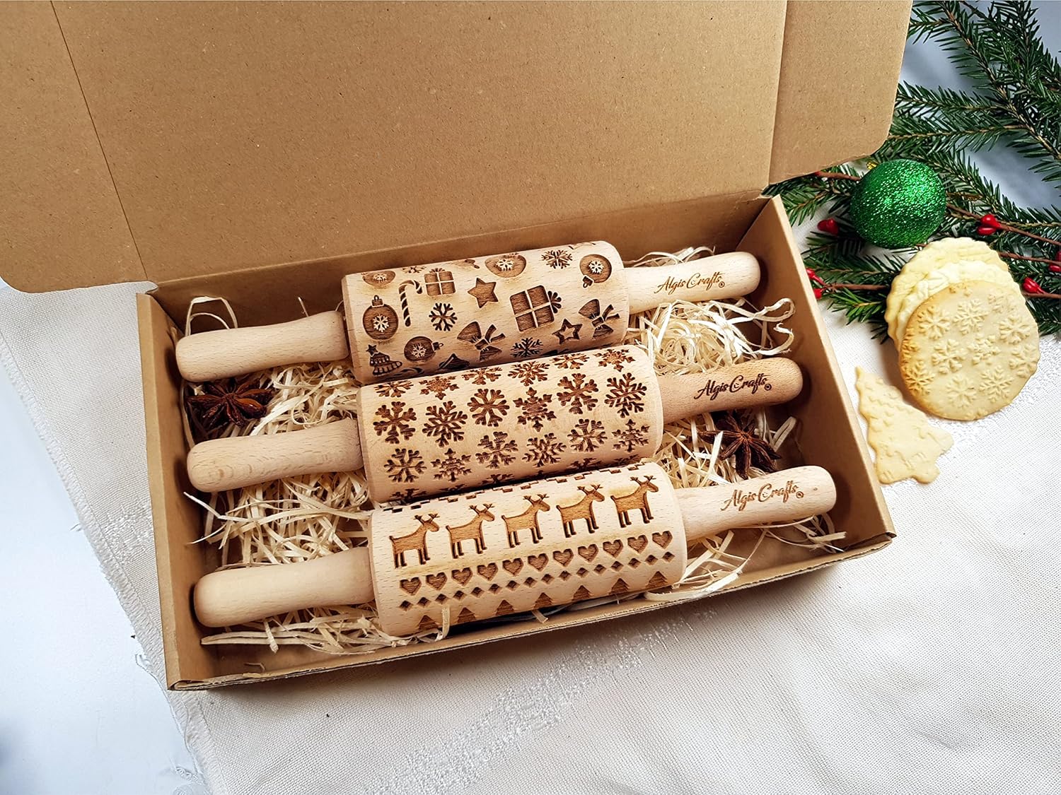 CHRISTMAS 3 Mini Embossed Rolling Pin Set Wooden Laser Engraved Textured rolling pins with Snowflakes, Elks, Christmas Trees and Gifts for Cookies by Algis Crafts