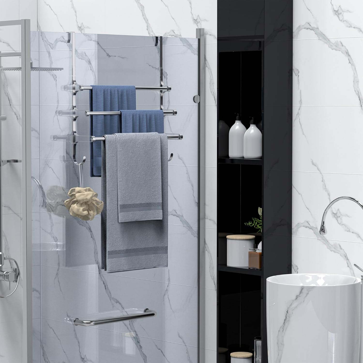 - 【Easy Assembly & Extra Hooks】 Comes with 5 piece accessories, easy to install, it only takes 5 minutes to be fully assembled. Practical bathroom towel rack with hooks, this over the door towel rack adds extra towel storage space for bathroom, especially for small bathroom