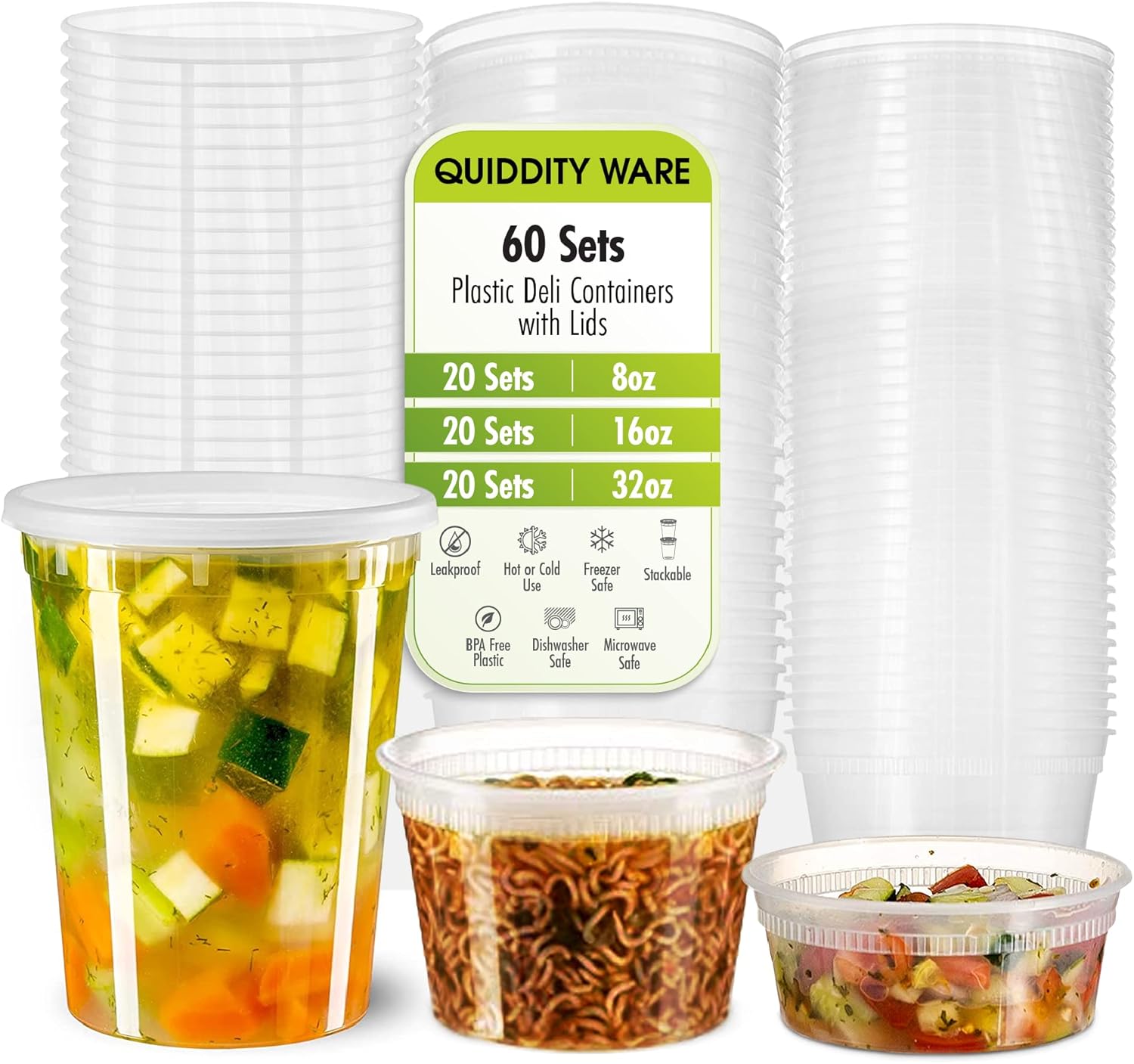 Deli Containers with Leakproof Lids-60 Sets [ 20sets-8oz, 20sets-16oz, 20sets-32oz] BPA-Free Plastic Microwaveable Clear Food Storage Container Premium Heavy-Duty, Freezer & Dishwasher Safe…