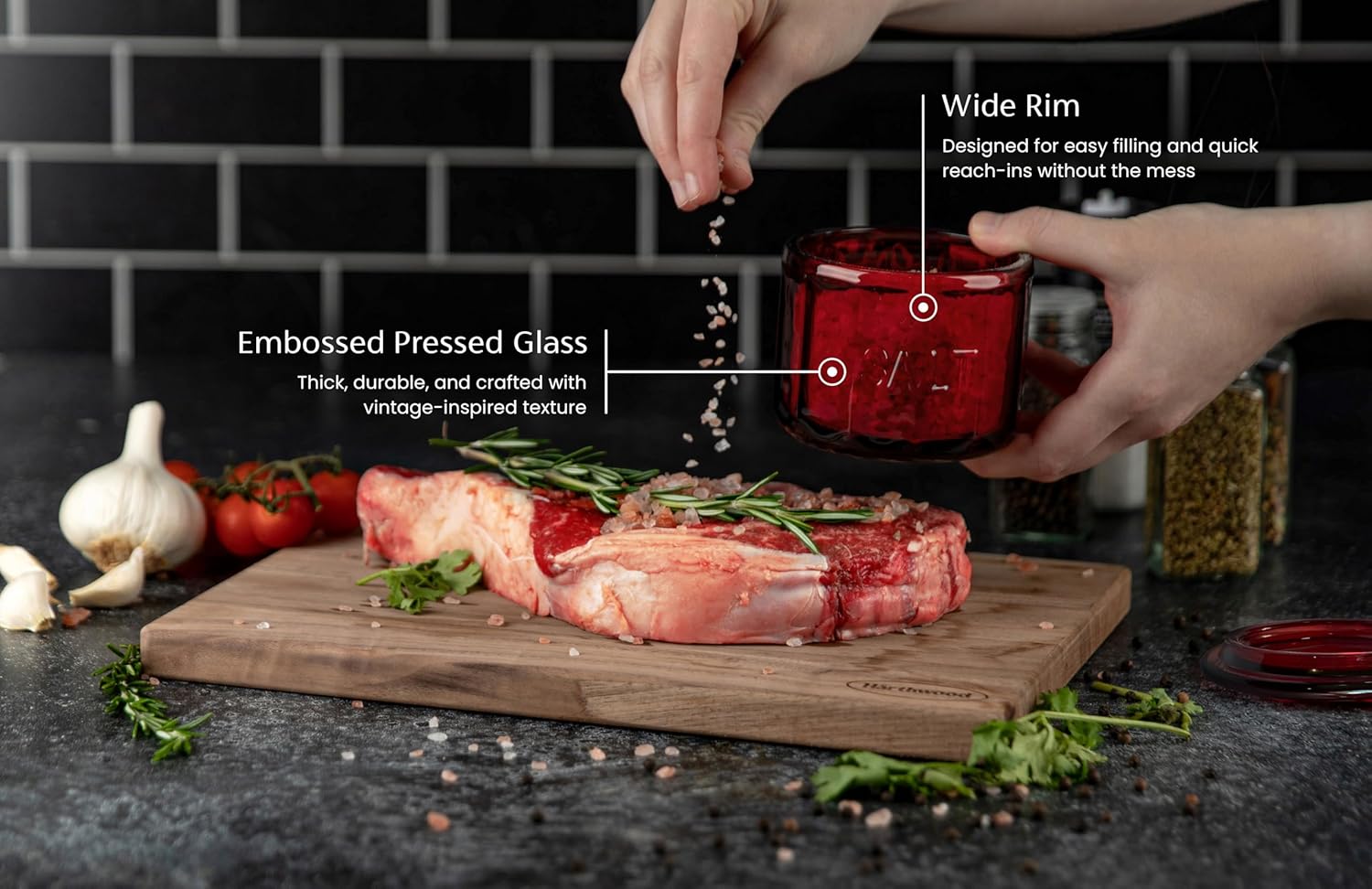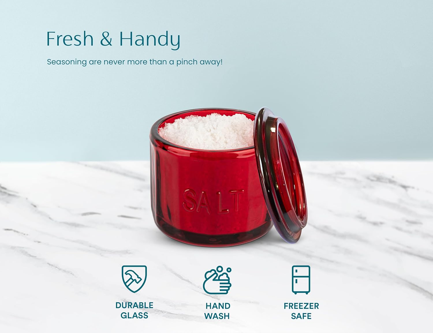 KooK Glass Salt Cellar, with Lid, Embossed Pressed Glass, Clear Storage Container, for Coffee, Sugar, Spices and Candies, 10 oz (Ruby Red)