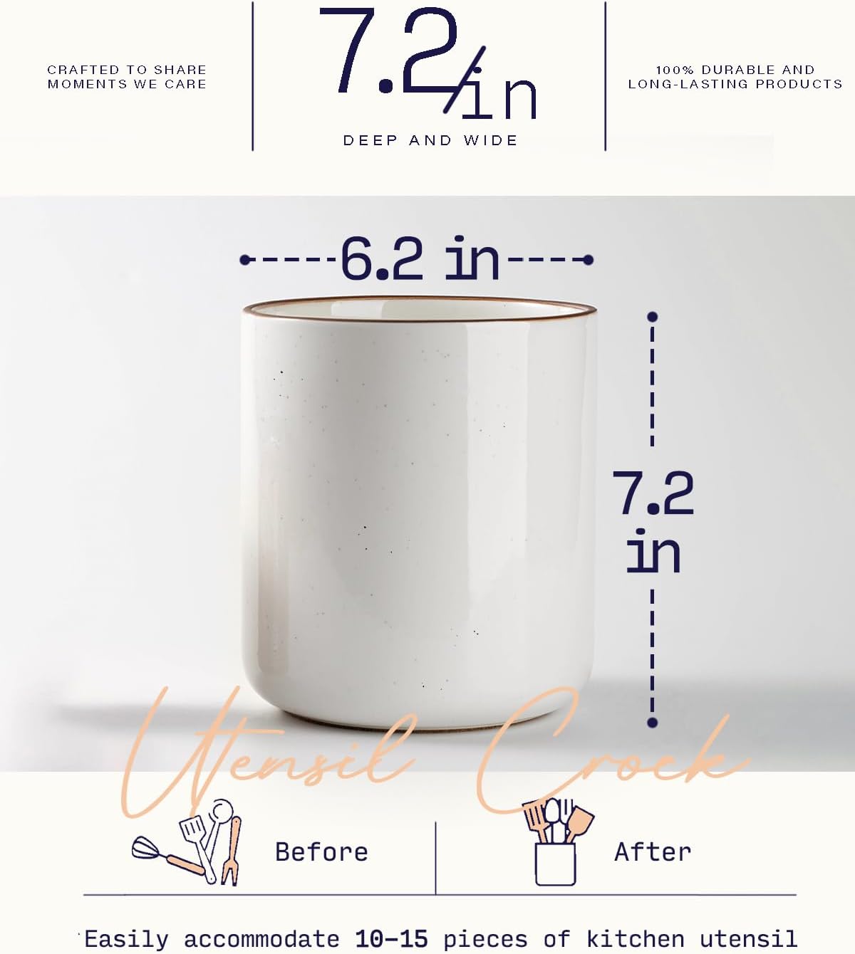 - [Large Utensil Holder] With a 6.2” width and 7.2” height hence enough space for storage, 10 to 15 pieces of common utensils can easily go into it, make utensils organized and easy to find, give you a neat and tidy kitchen
