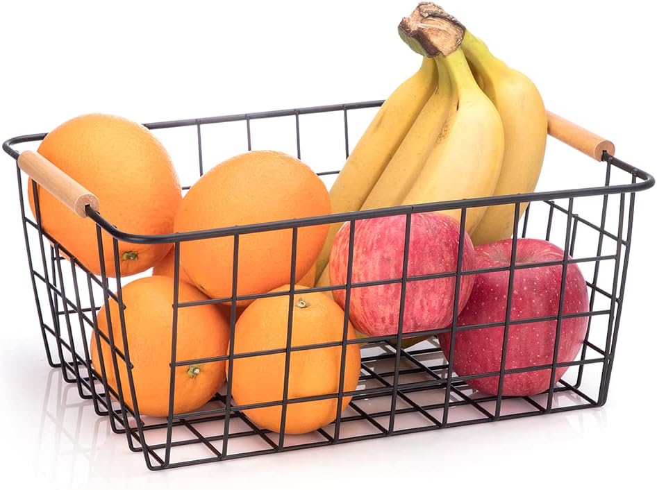 LeleCAT Wire Baskets with Wooden Handles, Wire Storage Organizer Baskets , Household Refrigerator for Cabinets, Pantry, Closets, Bedrooms - Set of 4(Black