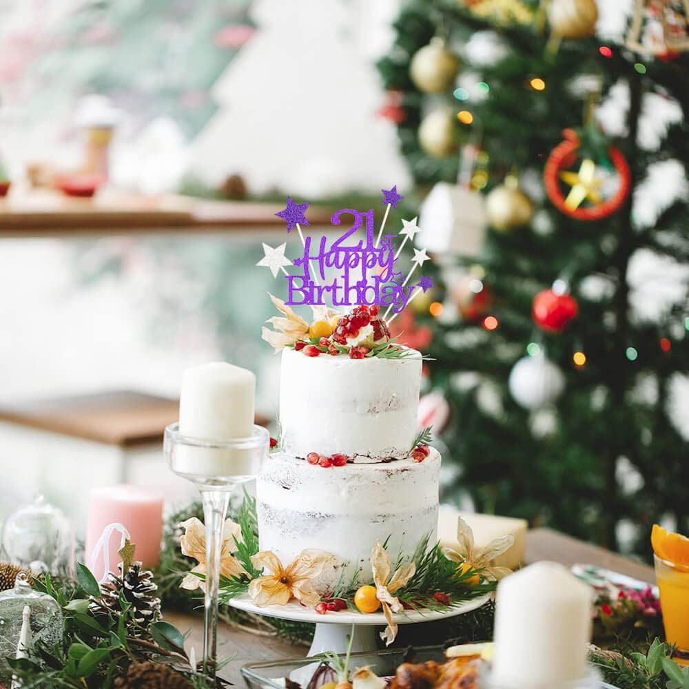 Glittery 21st Happy Birthday Cake Topper with Star,Personalised 21 Birthday Cake Toppers Party Decorations Party Supplies for Boys Girls Purple Silver