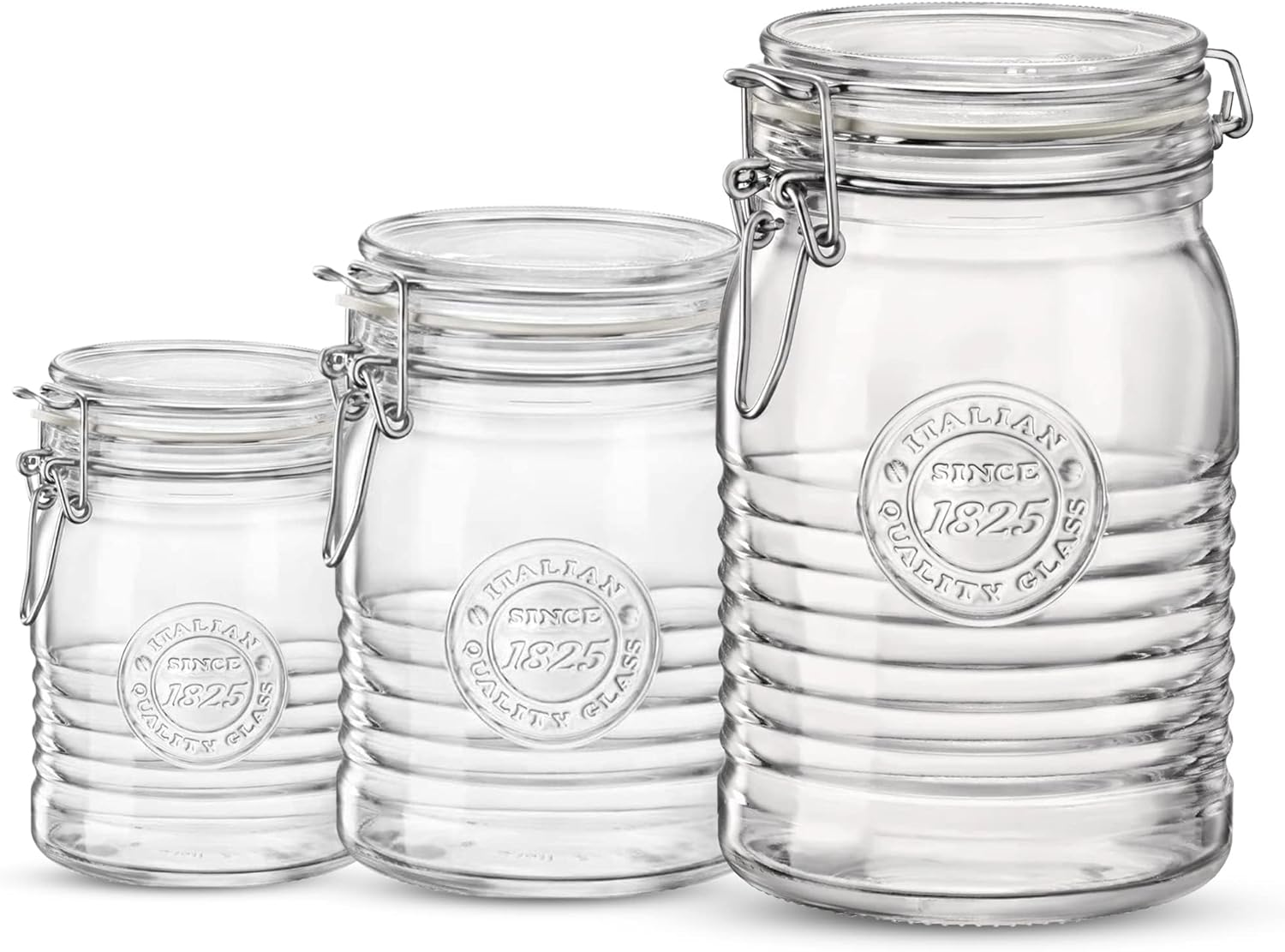 Bormioli Rocco Officina 1825, Set of 3 - Clear Glass Jars with Swing Top - Vintage Industrial Style Airtight Containers for Dry Food Storage, 33.75 Oz, 25.25 Oz, 17 Oz - Dishwasher Safe, Made in Italy
