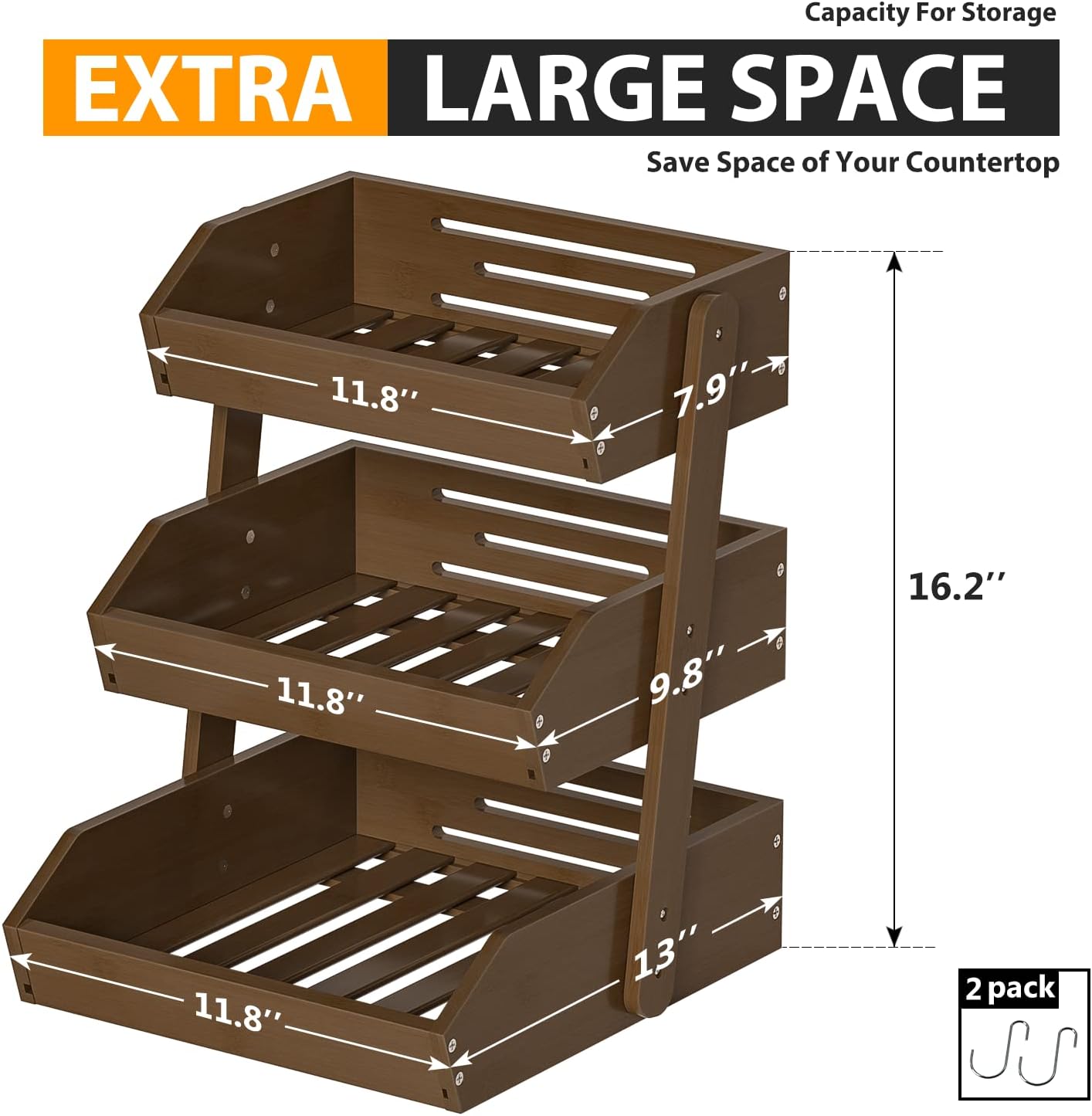 - LARGE CAPACITY: Gmtsl fruit basket for kitchen counter used as large wooden fruit bowl with 2 banana hooks, you can put fresh fruit,Bread,Snack in each tier. Different sizes(2 or 3 tiers) meets different vegetable storage needs (each basket can be used separately)