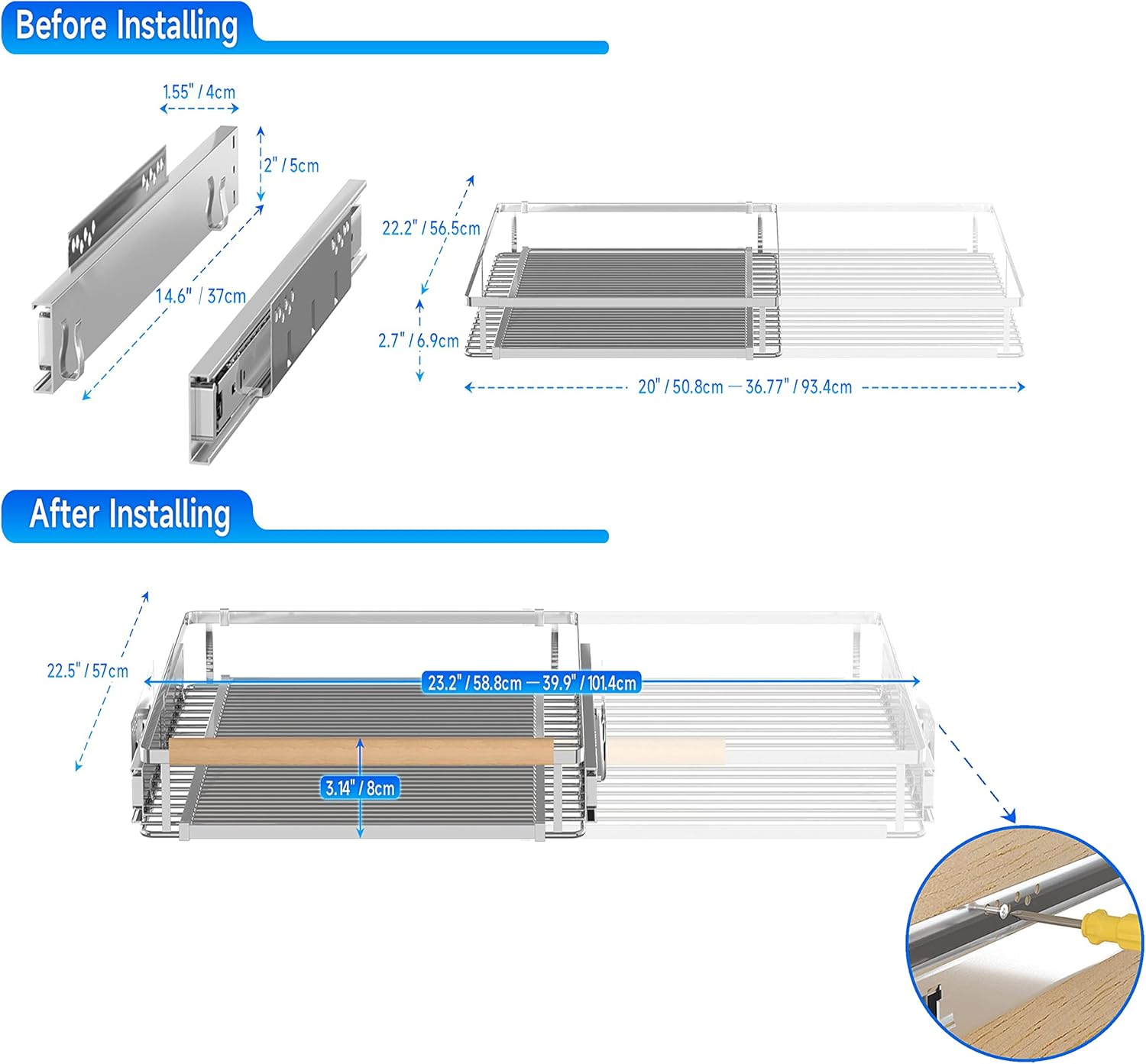 - ✔【Pull Out Drawers for Kitchen Cabinets with Adjustable Height】The improved slide out cabinet organizer is more flexible than the traditional pull out cabinet organizer; Its guide rail is installed on the side of the cabinet rather than the bottom of the cabinet; So it can be installed at any height; You can adjust the height of the installation basket according to your comfort; Note: Avoid the hinge of the cabinet during installation