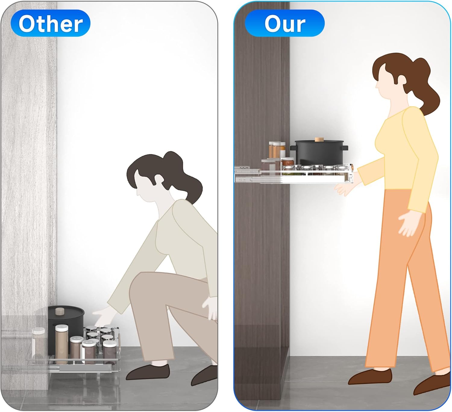 - ✔【Pull Out Drawers for Kitchen Cabinets with Adjustable Height】The improved slide out cabinet organizer is more flexible than the traditional pull out cabinet organizer; Its guide rail is installed on the side of the cabinet rather than the bottom of the cabinet; So it can be installed at any height; You can adjust the height of the installation basket according to your comfort; Note: Avoid the hinge of the cabinet during installation