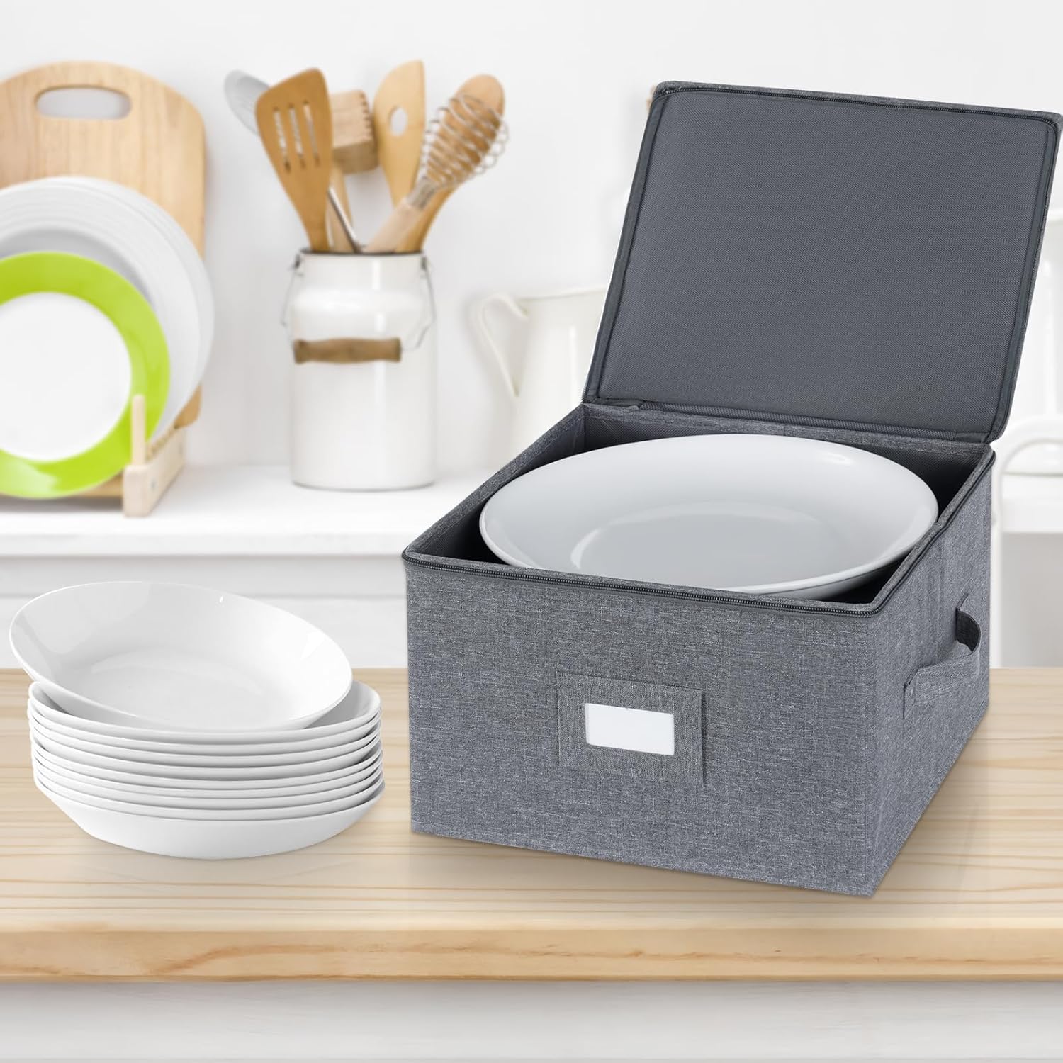 - STACKABLE DINNERWARE STORAGE ORGANIZER - The plate storage containers has a sturdy top, bottom and side. It is 12" W x 8" H. Added protection when storing, transporting or moving you china dishes. It includes a label holder to easily identify contents.