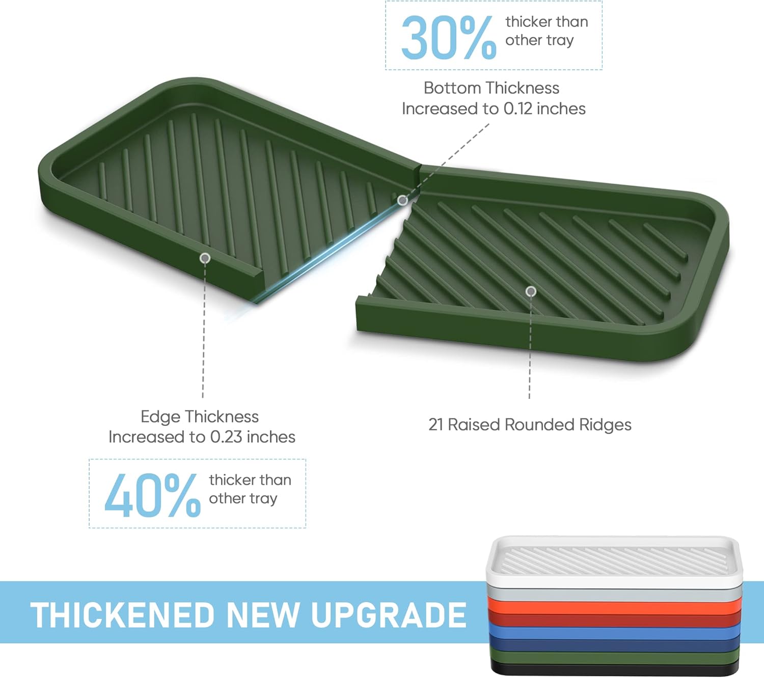 - 【Optimized Design】Our kitchen sink tray has been redesigned to increase the edge thickness by 40% to 0.23 inch and the bottom thickness by 30% to 0.12 inch,which greatly improves the overall quality of the tray. This silicone sponge holder is non-slip and can be stabilized on the counter , keeping it dry and orderly.