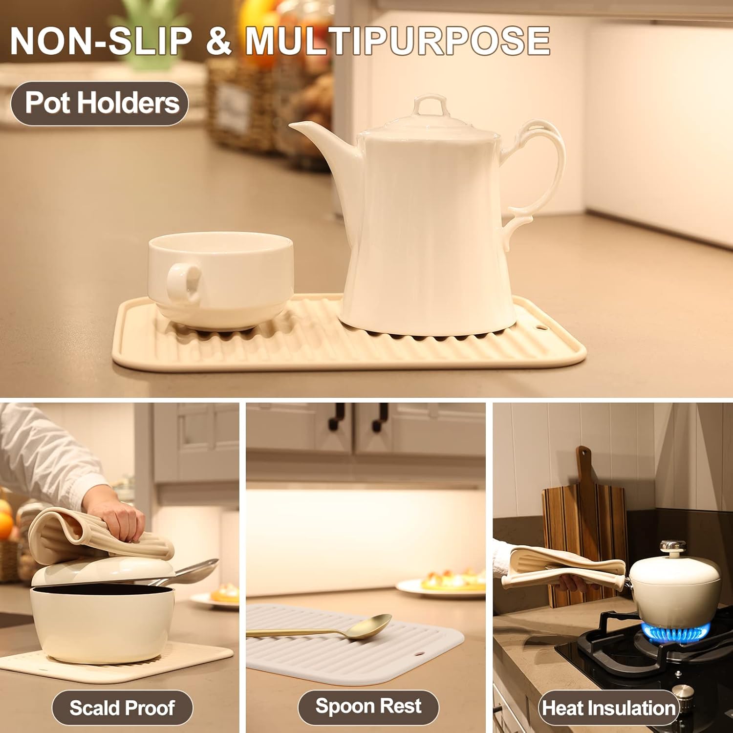 - MULTIPURPOSE KITCHEN TOOLS - Our silicone trivets for hot dishes are non-slip, flexible and soft enough to comfortably grab hot pots and pans, jar opener, drying mat or potholders. Silicone hot pads for kitchen are perfect for use in an oven, microwave, or freezer, protect your hands from hot and cold.
