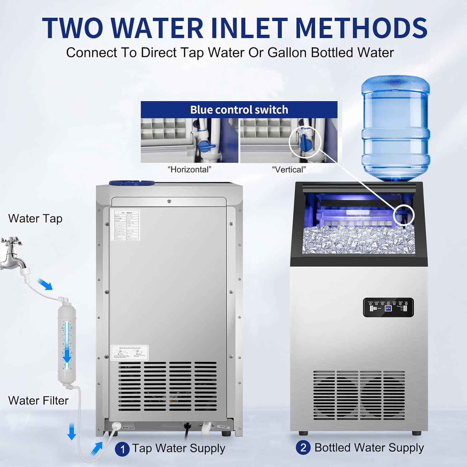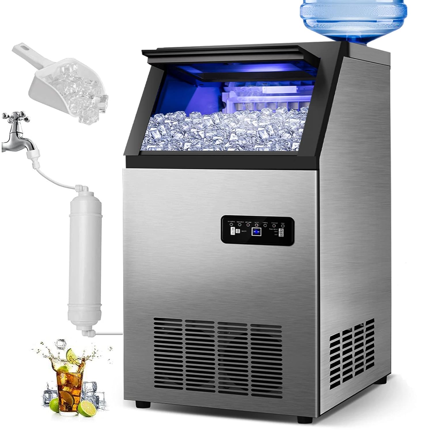 - 【2 WATER INLET MODES】- The Freestanding Ice Maker Machine supports 2 ways to add water -- tap water and gallon bottled water, the premium water filter can turn tap water into pure water, which makes the ice cubes crystal clear and harder, cloudless, and chewable, can meet the needs of commercial ice machine and household ice maker. Great for home, restaurant, bar, hotel, etc. In addition, an ice scoop is available to facilitate ice fetching.