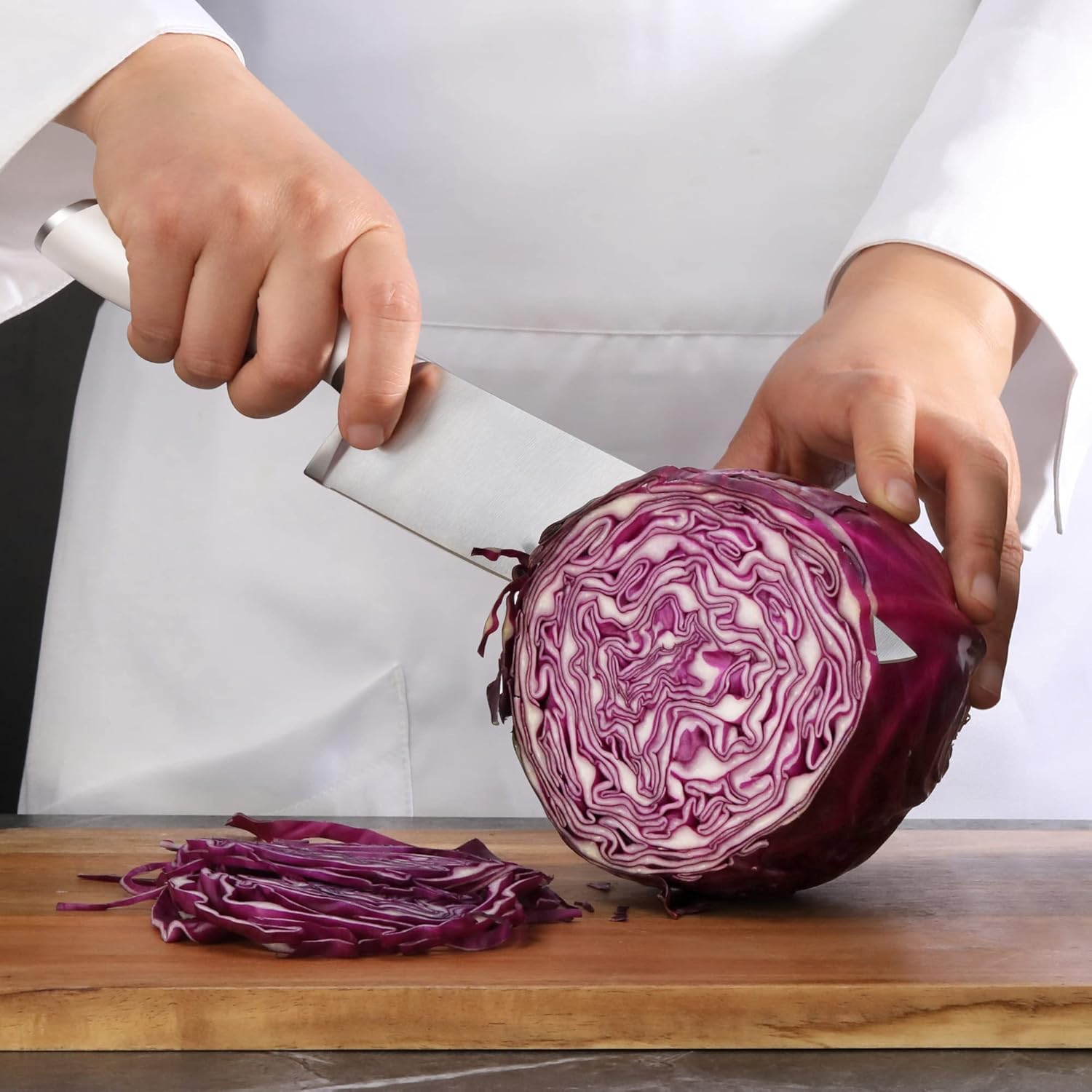 - 23-Piece set includes: 9" Carving Knife, 8" Honing Sharpening Steel, 8" Bread Knife, 8" Chef's Knife, 7" Santoku Knife, 7" Nakiri Knife, 6" Boning Knife, 6" Carving Fork, 5" Tomato Knife, 5" Serrated Utility Knife, 5" Utility Knife, 8 x 5" Fine-Edge Steak Knives, 3.5" Paring Knife, 2.75" Peeling Knife, 9" Come-Apart Shears, and Solid Acacia Knife Block. Please note: storage block is counted as an individual piece.