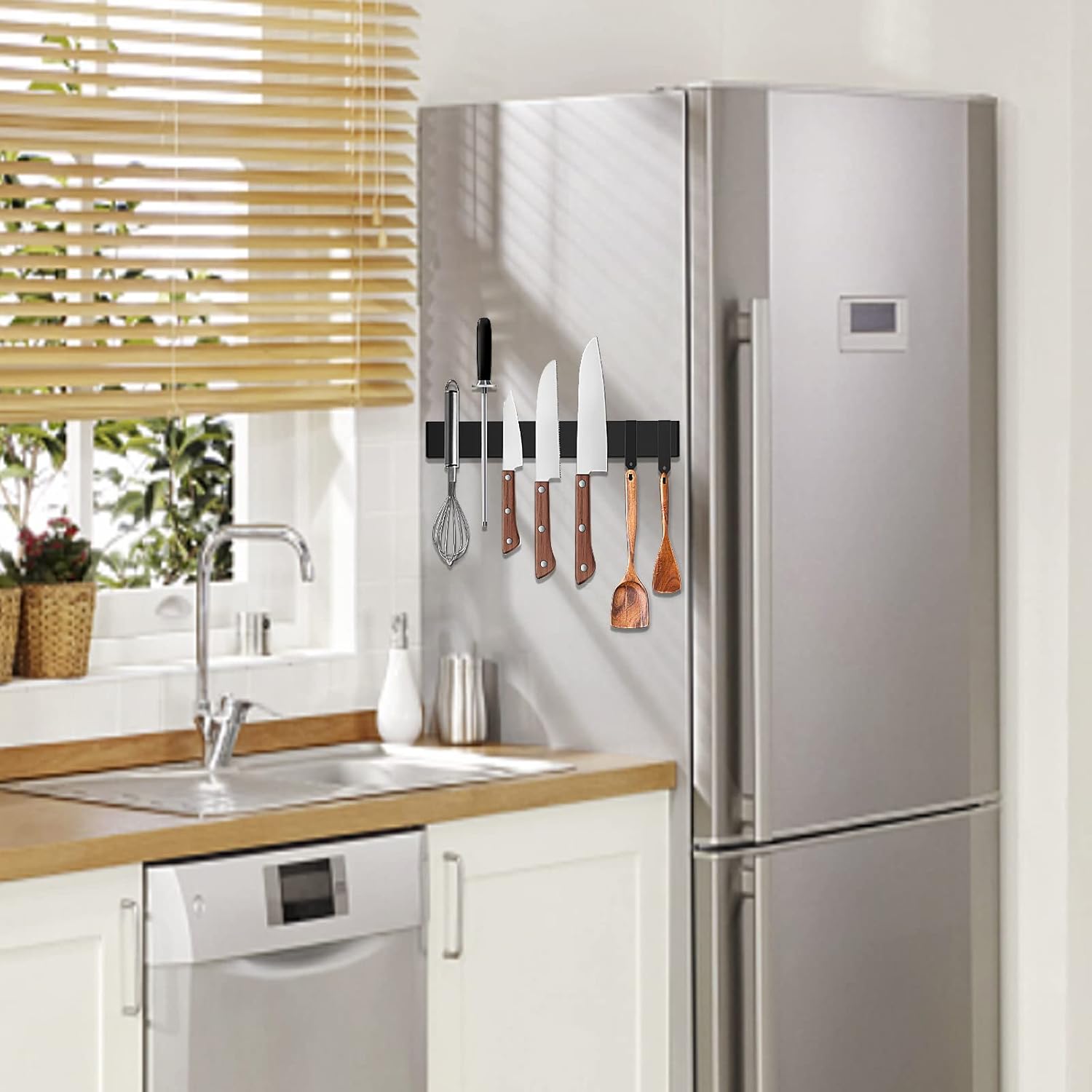 Black Magnetic Knife Strip for Refrigerator - Larger 17 inch Double Sided Stainless Steel Magnetic Kitchen Knife Holder with hooks for Wall/fridge - Strong Knife Strip Magnet/Knife Rack/Knife Bar
