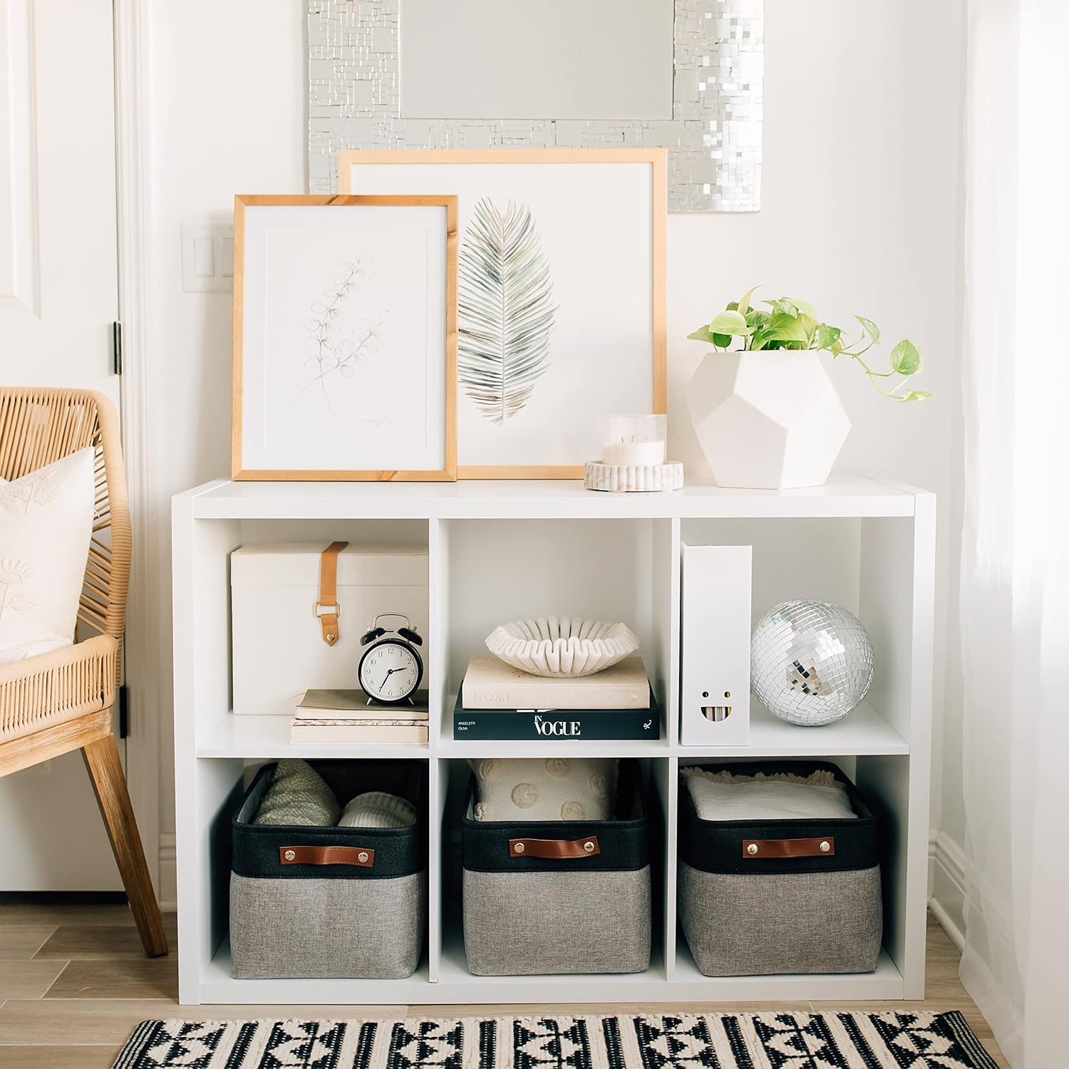- Decorative Fabric and Vegan Leather – These versatile storage baskets for organizing your everyday life are made with a thick, high-quality fabric and fitted with leather handles to add a stylish touch to a living room, bedroom, office, or personal space.