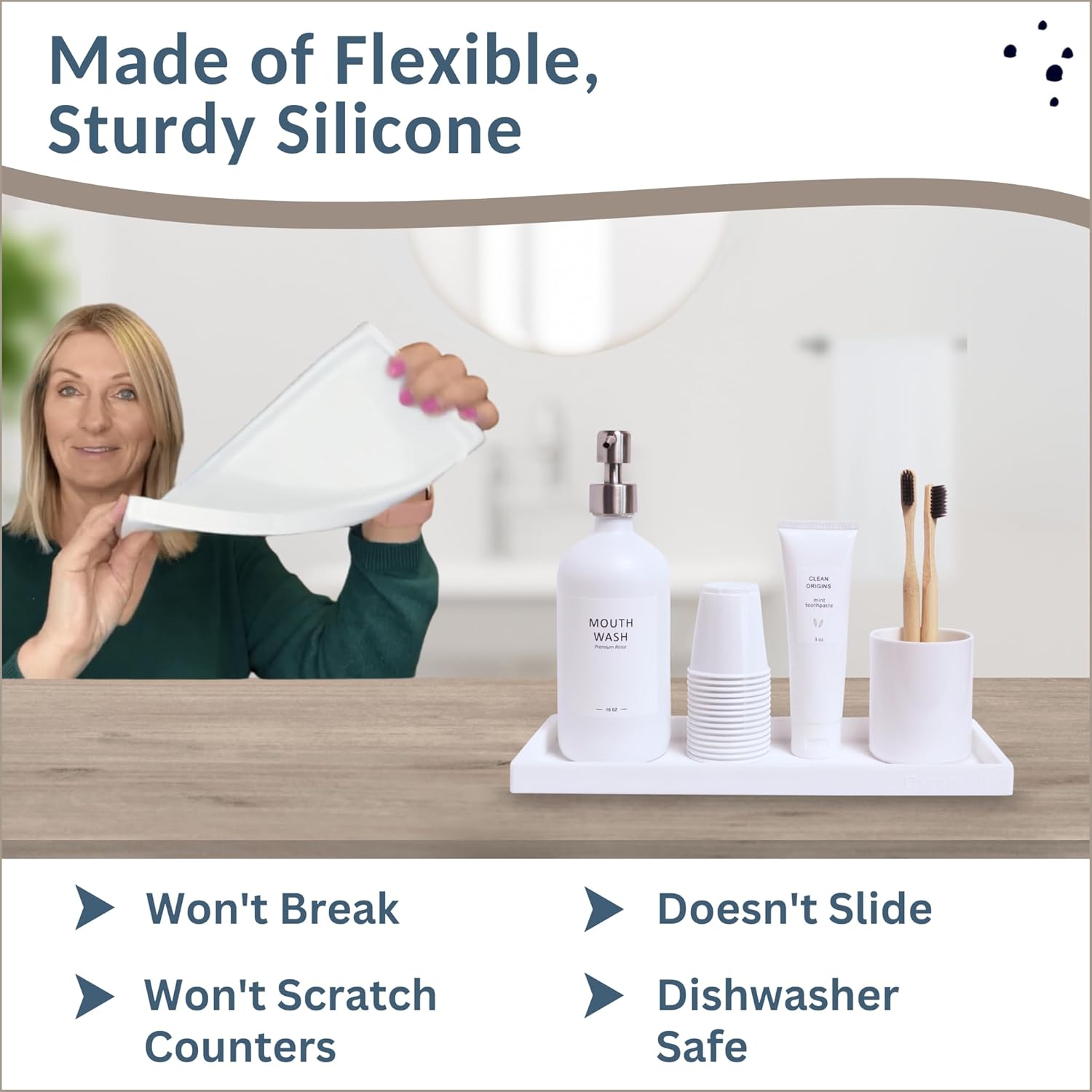 - Smooth Silicone, No Ridges – Keeps your items stable and is easy to clean. This white tray is ideal as a bathroom countertop organizer, soap and mouthwash dispenser tray, or sink caddy for your bathroom essentials.