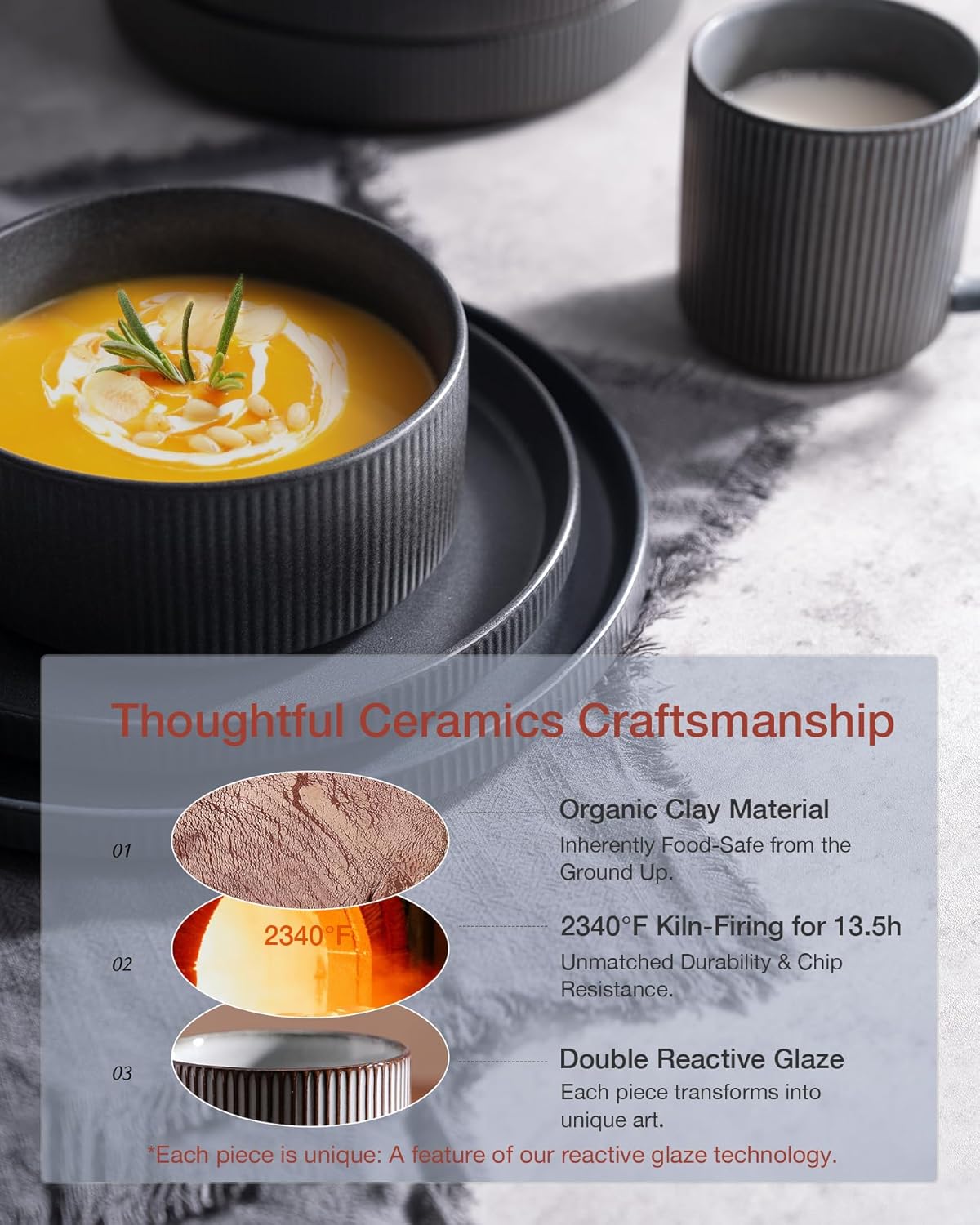 - [Everyday dinnerware]: Our premium stoneware dinnerware crafted from organic and natural clay, is LEAD-FREE and CADMIUM-FREE. It ensures safety for both your family and the environment. You can savor all kinds of meals, including steaks, salads, and desserts, with complete confidence