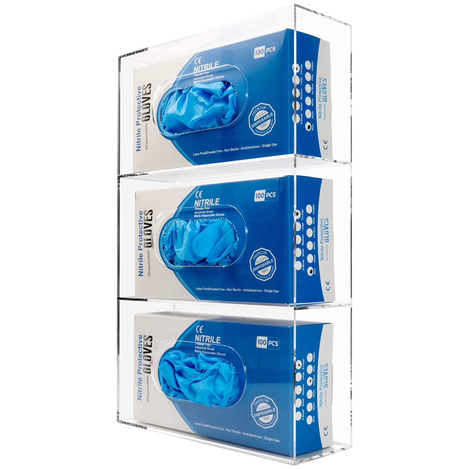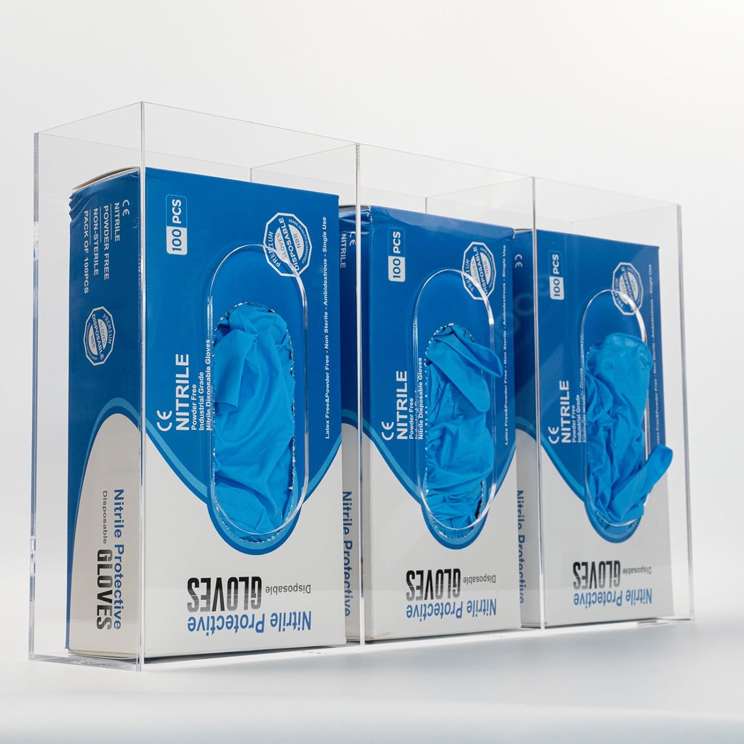 Glove Box Holder Dispenser Acrylic Triple Compartment Side Loaded Clear Rack Storage Organizer for Medical, Latex, Rubber, Nitrile, Exam, Disposable Glove Boxes Holder Standing or Wall Mount