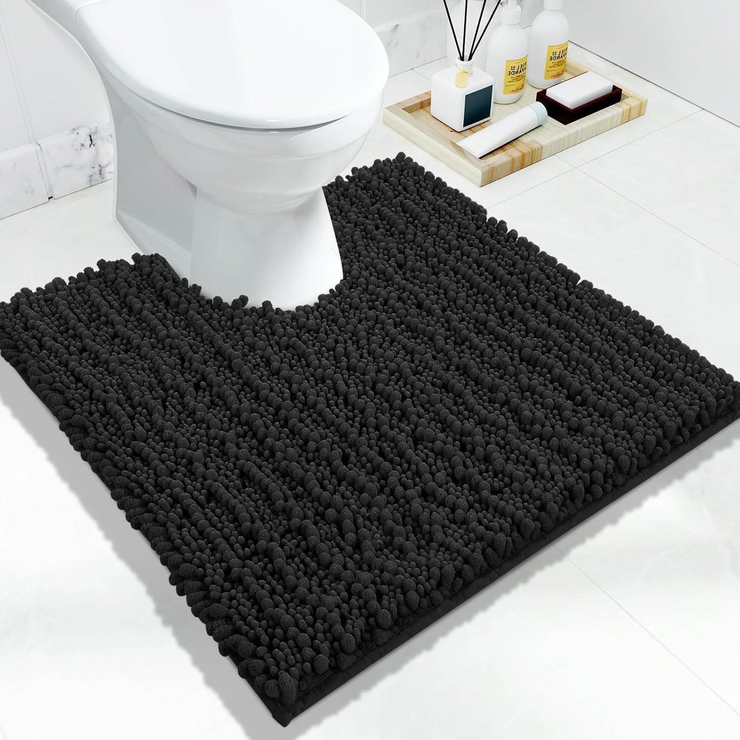 Yimobra Toilet Rug U Shaped Washable 24x20 Inch - Ultra Soft Absorbent Chenille Bath Rugs for Toilet, Quick Dry & Machine Washable, Non Slip Contour Bathroom Mat, Black