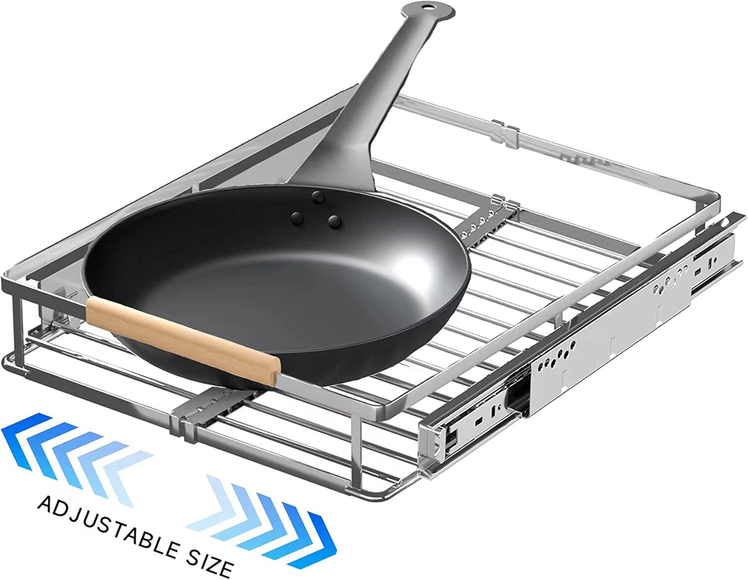 - Expandable Pull Out Shelf: The width of cabinet pull out shelves can be adjusted according to the width of your cabinet (please confirm that the opening of your cabinet is between 11.8 and 18", and the depth of the cabinet is more than 17.3"), so as to improve the use efficiency of cabinet space. The slide out shelf is suitable for many places. Such as kitchen to store pots, pans and spice racks.Organize clothes, dolls, etc. in the closet. Maybe there are some new uses you might not think of