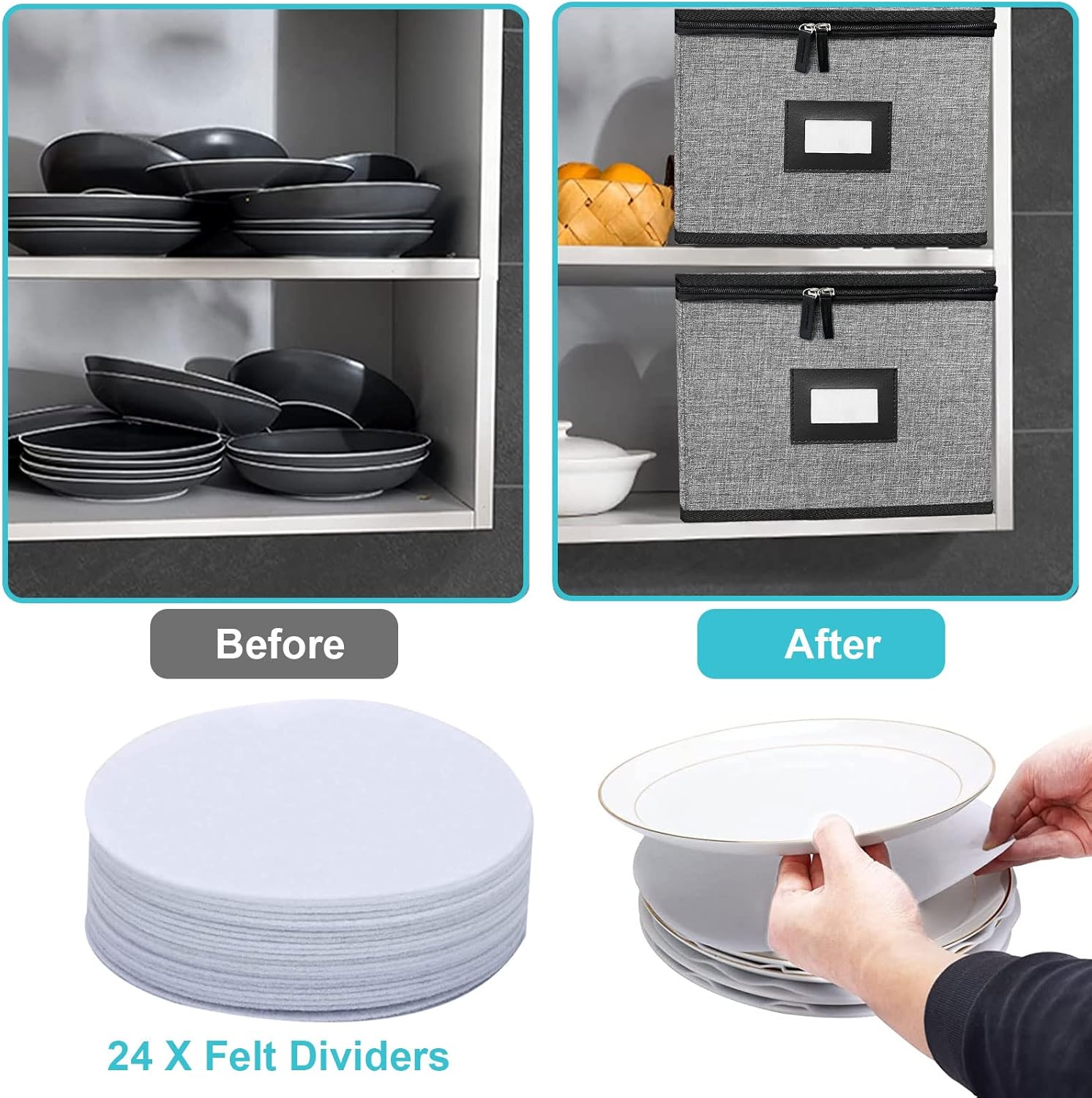 - Product List:Contains four dish storage containers.Total 48 Felt Plate Dividers presented.It is 12''L*12''W*8''H and can hold up to 12 pieces of 12" (or smaller) diameter dishes.