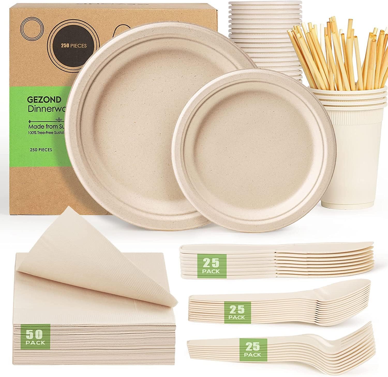 Gezond Compostable Paper Plates Set 250pcs Disposable Sugarcane Plates Utensils Eco-Friendly Plate, Cutlery, Napkins, Straws and Cups for Party 25 People
