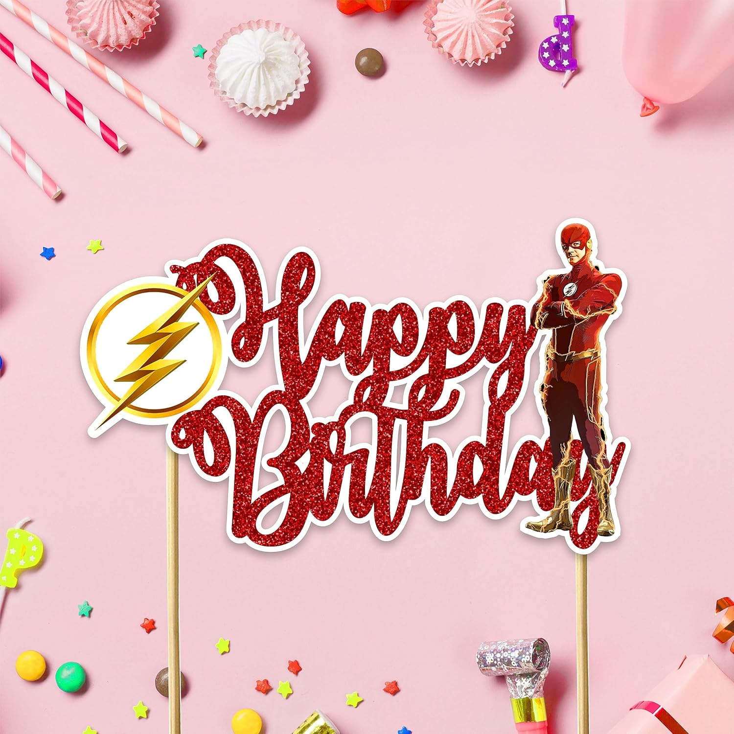 - Eye-Catching Design: The topper showcases a bold and colorful design that includes the Flsh emblem, perfect for adding a fun and heroic flair to your birthday cake.