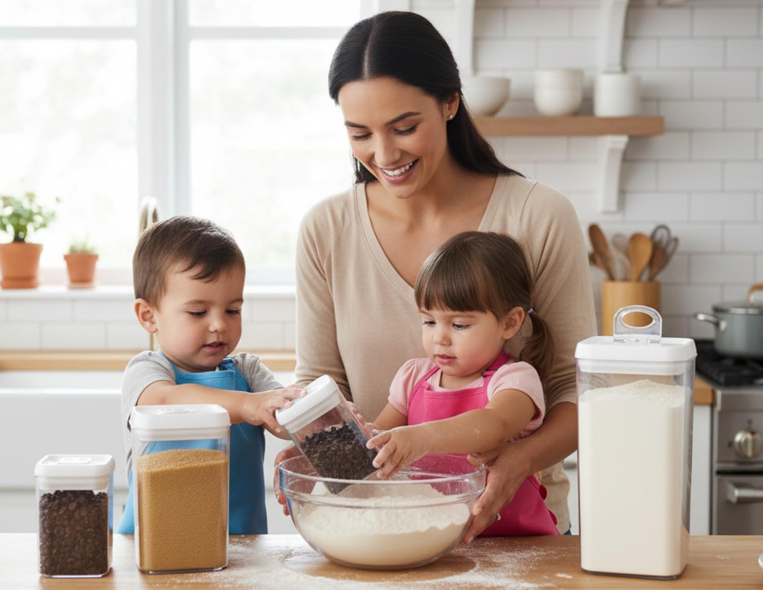 - 3 PIECES KITCHEN ORGANIZATION - BEGINNER SET (NEST-L): This beginner set features 3 x Flip-Tite containers in varying sizes, each designed to optimize your kitchen pantry organization. The set includes a 6 inch XL-Tall container (4.9 qt), a 5 inch LARGE-L container (3.5 qt), and a 4 inch REGULAR-M container (0.8 qt). Each container is meticulously calibrated to store a variety of common household staples such as rice, cereal, pasta, spaghetti, oatmeal, baking ingredients, protein and smoothie powders, sugar, flour, and coffee. These versatile containers are also great for organizing snacks, makeup, laundry supplies, and craft materials.