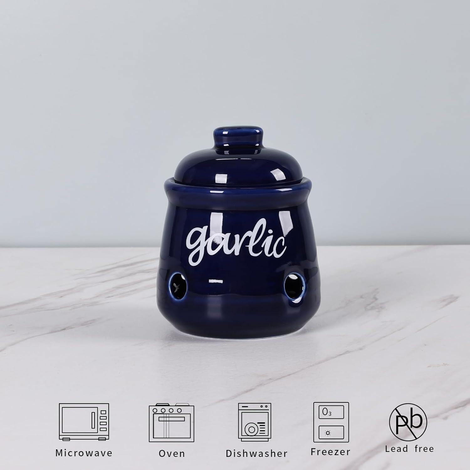 HAOTOP Garlic Keeper with Lid, Ceramic Mini Garlic Saver Container for Countertop, Farmhouse Kitchen Decor (Navy)