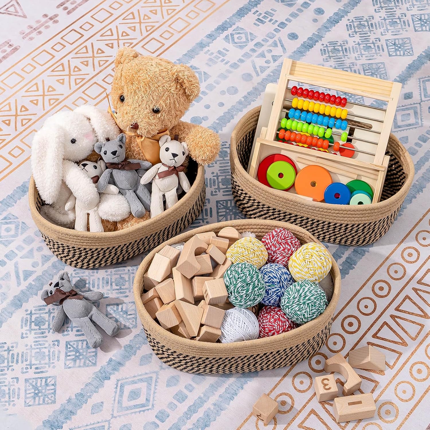- Classy Natural Cotton Rope Storage Baskets-High quality well made. Very sturdy and a cute modern style. Durable woven rope, Long-lasting, skin-friendly, soft and attractive. You need these adorable baskets to put some supplies in, diaper, jewelry, cosmetics, makeup brushes, tea bags, storing smaller toys, toddler socks, candy