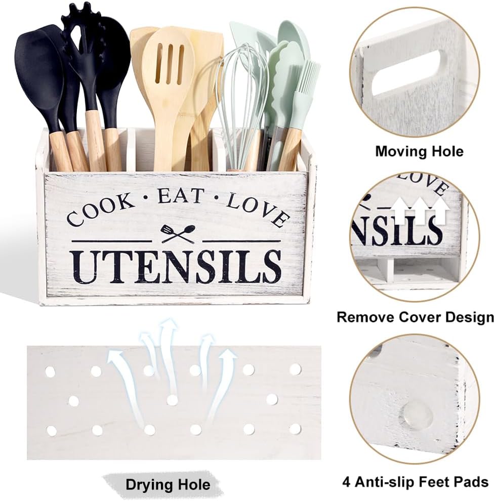 - 💝【Thoughtful Kitchen Gift Idea】This farmhouse wooden utensil holder is a beautiful and thoughtful present for moms, dads, couples, housewarming and more! It can greatly assist in organizing and storing kitchen supplies, making it an irresistible and perfect gift for those who value order and organization. Handle hole design made it easy to move around and match to occasions like counter, kitchen table, dining room, patio, wedding party and etc.